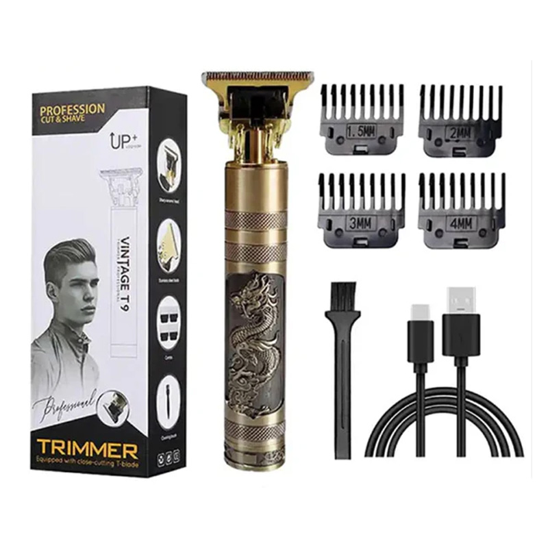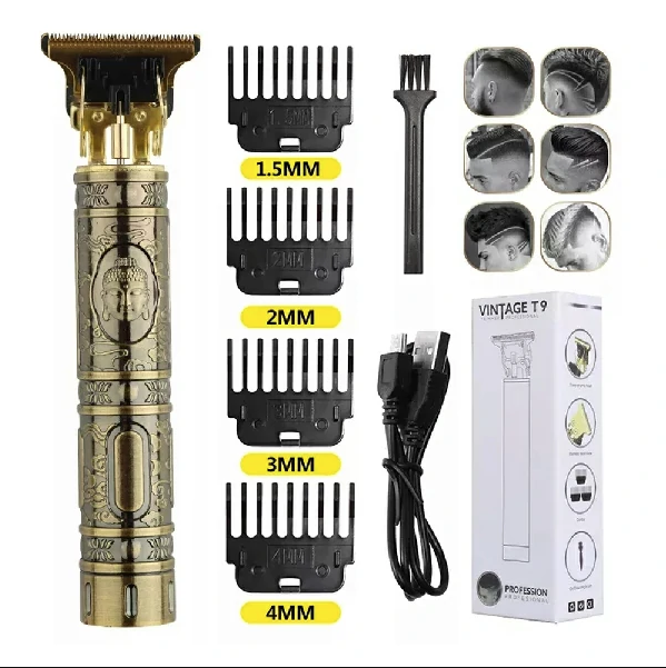 The Vintage T9 Trimmer Hair Cutting Machine is designed for professional and home use. With its sharp stainless steel blades, it ensures smooth and precise trimming. The powerful yet low-noise motor makes it comfortable to use. It comes with a rechargeable battery that supports USB charging, making it convenient and travel-friendly. The vintage metal design not only looks stylish but also ensures durability. Perfect for men’s grooming – whether it’s beard shaping, hair cutting, or detailed styling.