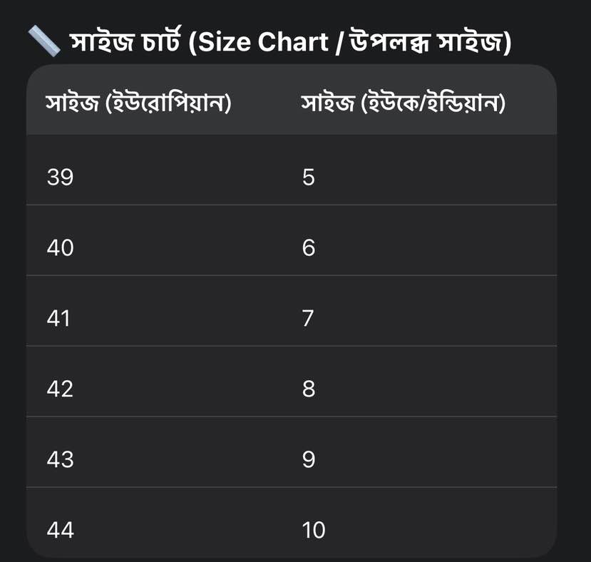 • 📏 উপলব্ধ মাপ: EU 40–44, মাপের সাথে খাপ খায়