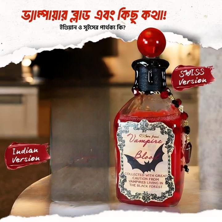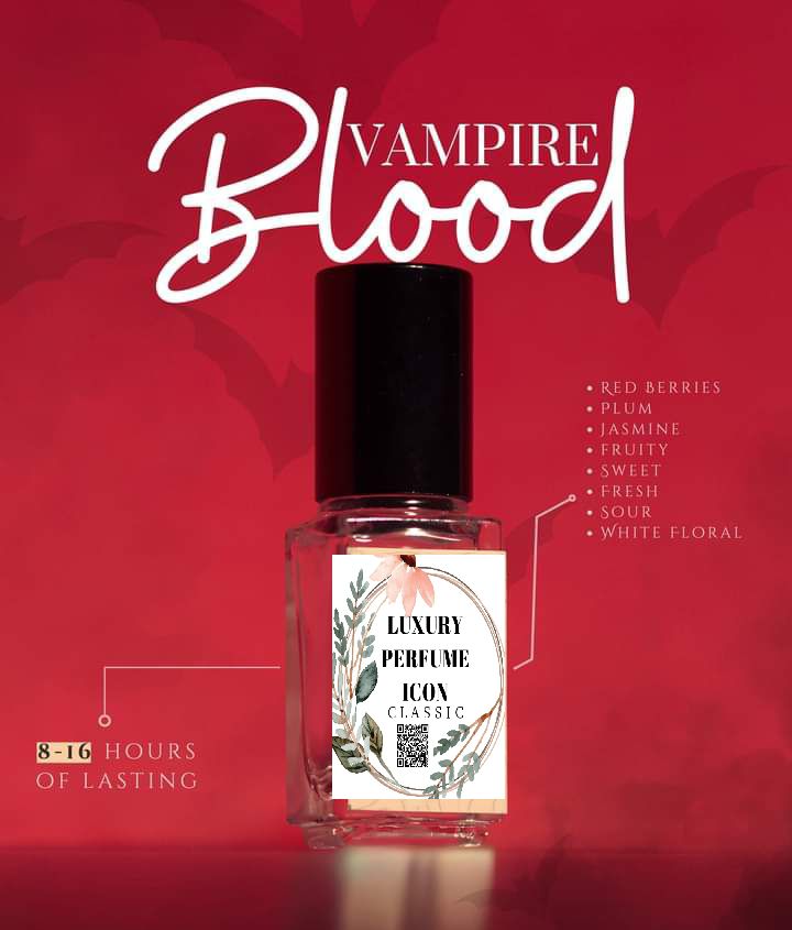 "ভ্যাম্পায়ার ব্লাড পারফিউম অয়েল: শক্তিশালী মিষ্টির মিশ্রণ, যা ডার্ক বেরি, ভ্যানিলা, পাউডারি, সুইট ফ্রেশ, এবং শ্যাম্পু ফ্রেশ সুগন্ধির এক অদ্ভুত সংমিশ্রণ।"