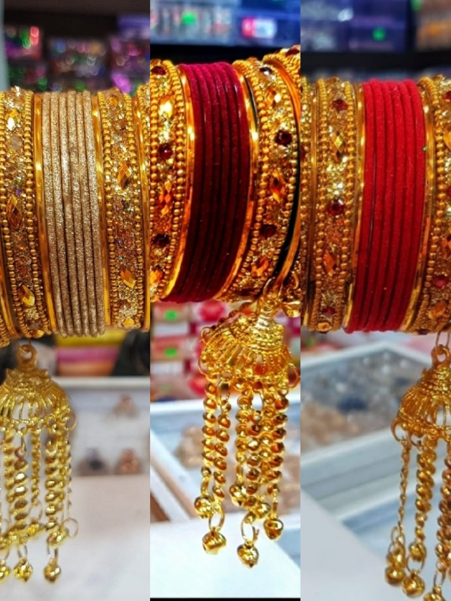 Titel: 1 Set New Indian Bridal Jhumka Bangles/Churi Package For Girls-(1 full set) Shop: Purple Hut Ctg Type: Set Bangles/Bridal Set Quantity: 1 Full Set As Per Picture Color: Red/Maroon/Golden Size: 2.6/2.8 Wear: Occasionally New Stylish Metal Bangles Materials: Metal With Stone and Added Jhumka Style: Women Bangles
