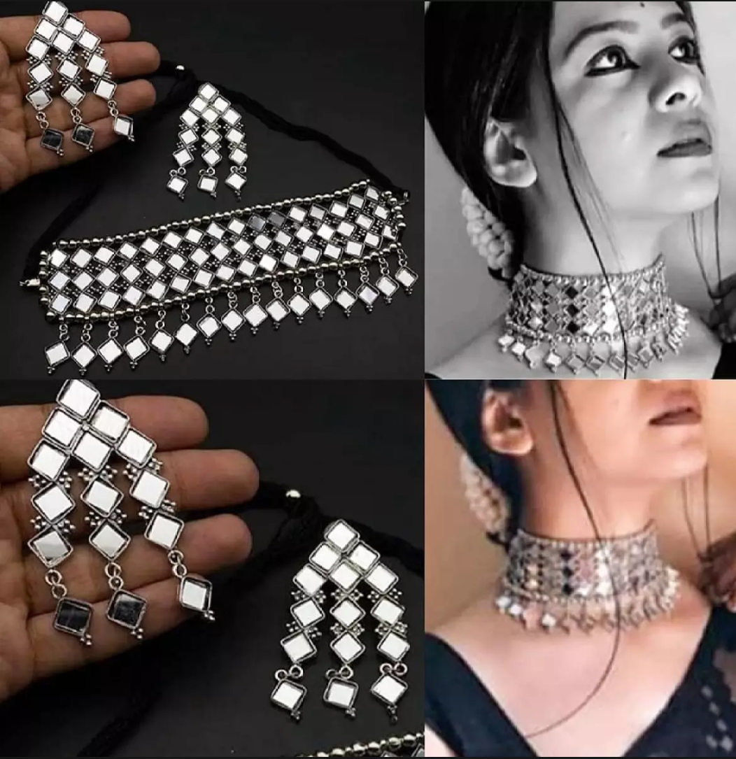 Fida Ethnic Silver Mirror Work Choker Necklace And Earrings Jewellery Set For Women. One of our favourites and the most adorned. Our Mirror Choker necklace set will be an exuberant addition to your jewel box. Carefully crafted in silver that enhanced Shiny mirror cut works that add elegant character to your look. This set is versatile and goes with almost everything in your collection. A piece of jewellery that will leave an everlasting impression!Packing Includes-1 Necklace,1 Pair Earrings. The Perfect Gift : Ideal for the Woman who loves products that are Handmade In India and artisinal. All occasion jewellery for through out the year from Valentines Day ,a Special Birthday or an Anniversary gift for your special one. 100% Genuine Quality Product. 100% Handmade in India with Love Usage: Avoid contact with water and organic chemicals i.e. perfume sprays. Avoid using velvet boxes, and store in air-tight boxes. After use, wipe the jewellery with soft cotton cloth and you will enjoy your FIDA Jewellery for years to come