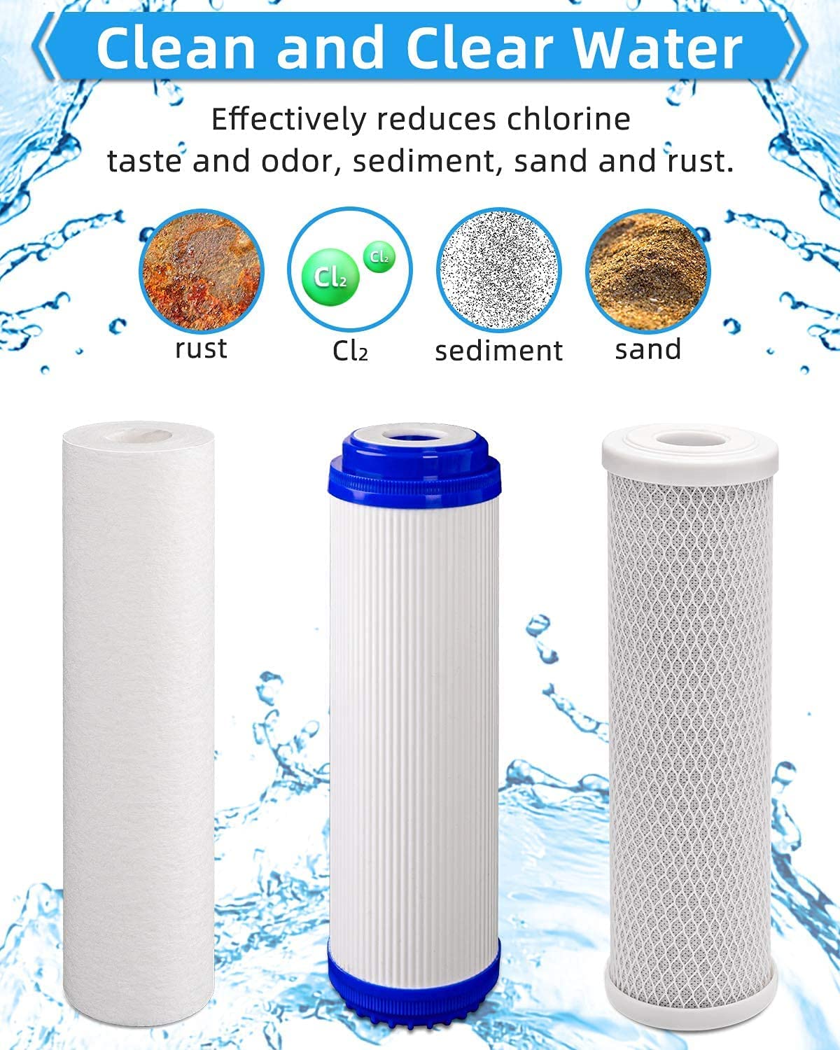 - [Safe and Clean Water]: This pre-filter set can remove dust, particles, and rust effectively and reduce 99% chlorine, taste & odor. This filter set provides healthy drinking water to your family and extends the lifetime of RO system.