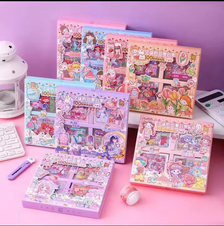 100 Sheets Stickers Box Space Park Anime Figure Pattern Decorative PET Cartoon Character Decals for Scrapbook