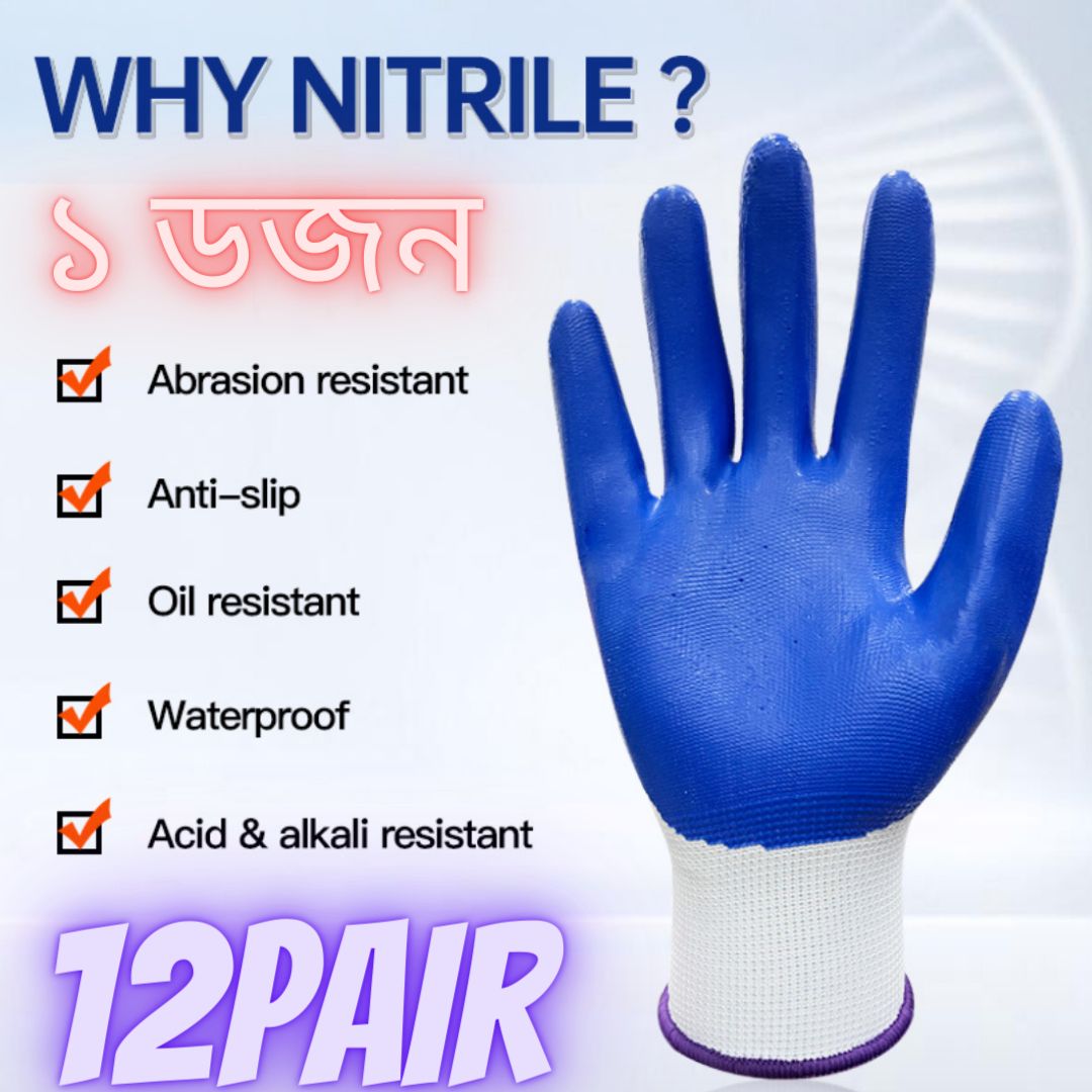 12 pair Nylon Rubber Coated Hand Gloves For Home and Office