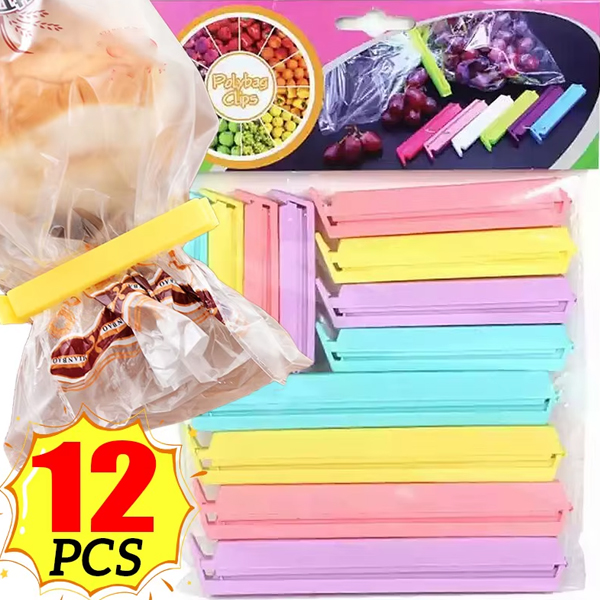 The 12 Pcs Food Snack Package Bag Sealing Clips are a practical solution for keeping food fresh and organized in the kitchen. Made from durable plastic, these multicolor clips securely seal snack and food bags, preventing spills and maintaining freshness. Ideal for daily kitchen storage and