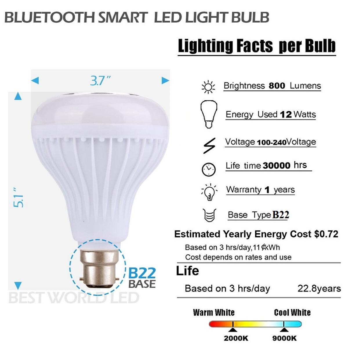 This bulb is a Bluetooth enabled, multicolored, energy efficient smart LED light which can be controlled through your smart phone by Bluetooth wireless, Energy saving and good quality Support music It can be controlled via smart phone or tablet / Bluetooth -LED Lamp Appearance / 16 Different Color Options.- Wireless Bluetooth connection. Adjustable volume of light and music – bright light, comparable to a 50 Watts halogen bulb. Do not disassemble any bulbs by yourself. The light color is adjustable by the remote controller with 4 modes lighting effects. Wireless Bluetooth Connection – The bulb can be turned off by to the remote control, and you can still use the is as a speaker. One remote controller can control multi bulbs (the light), but one bulb can only be connected to one. Bluetooth device (output sound)