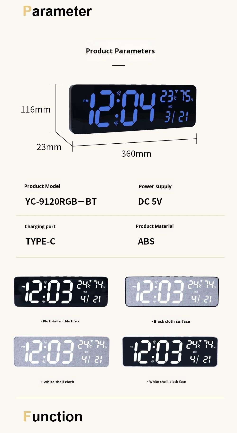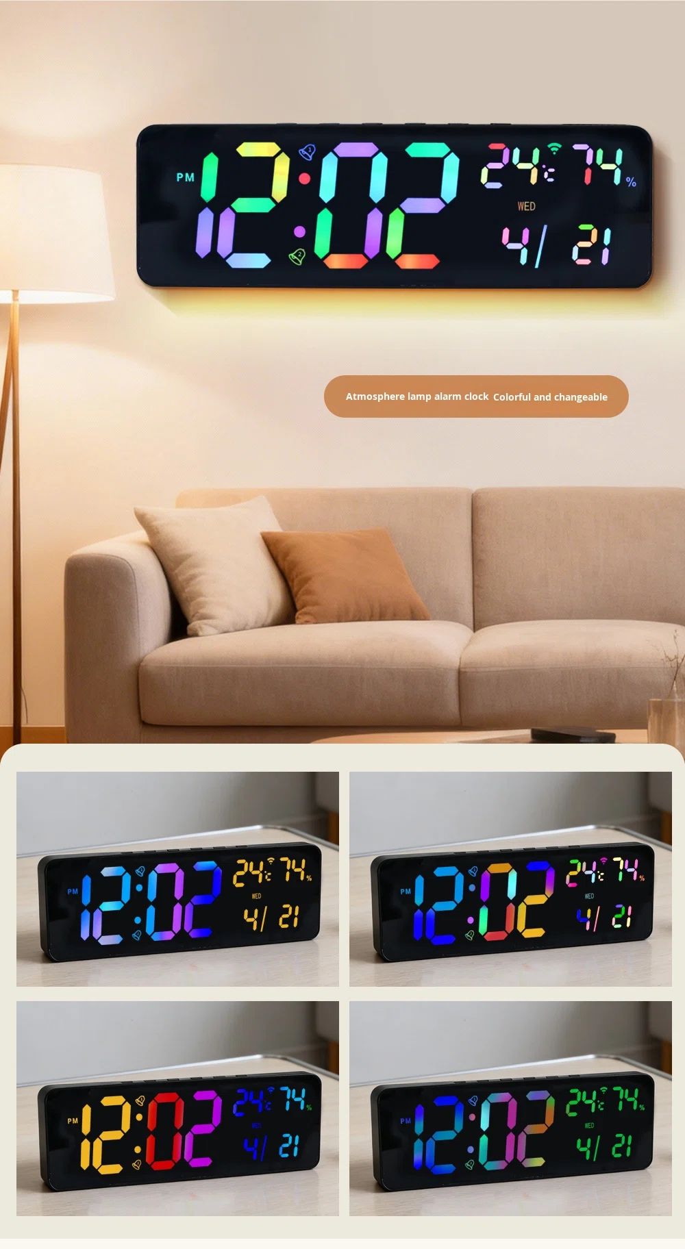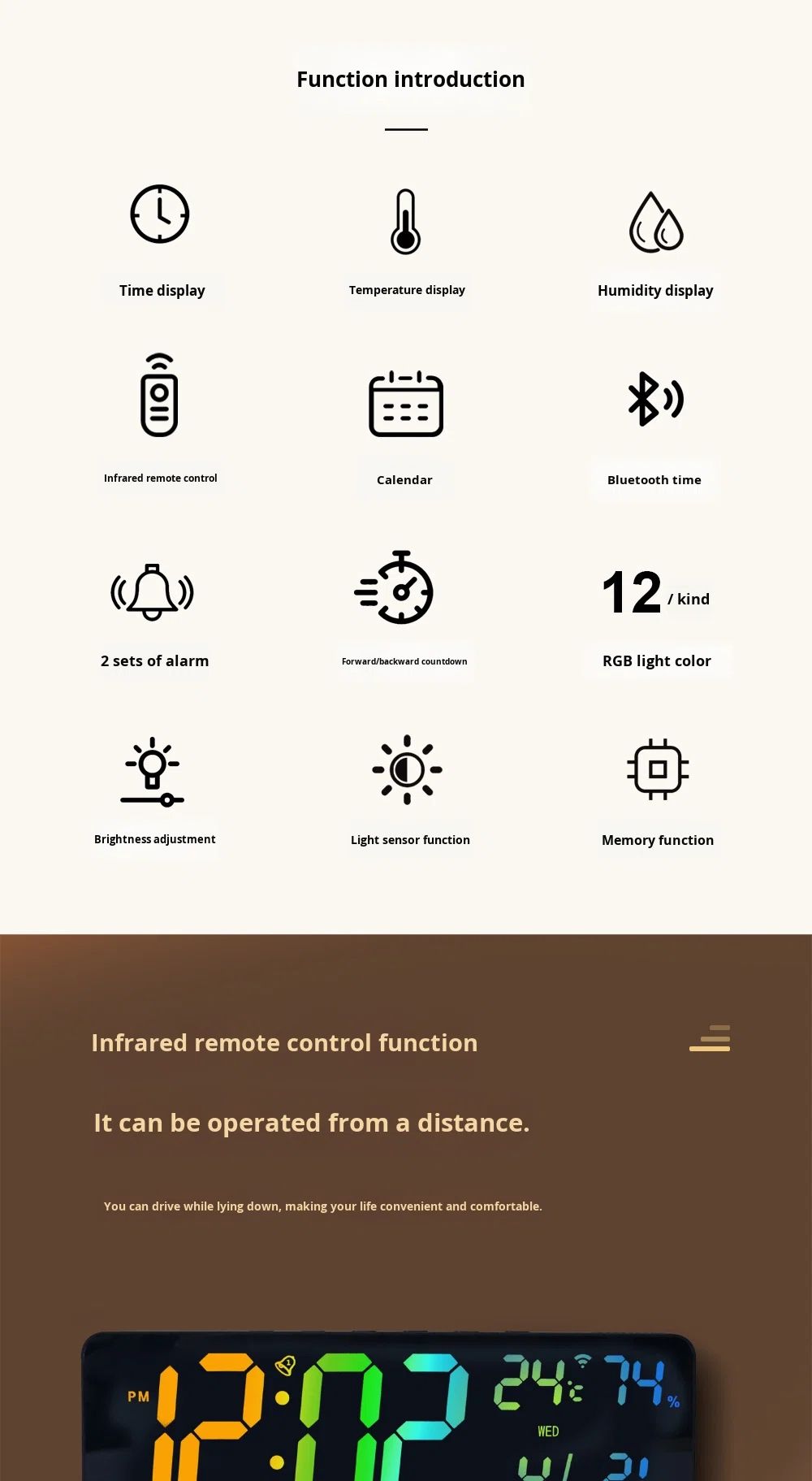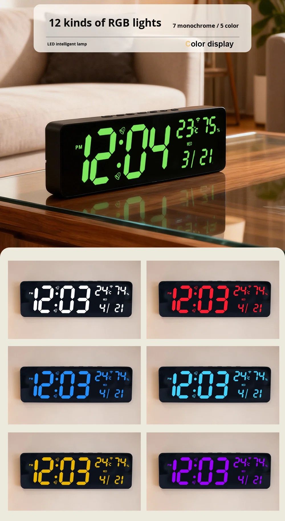 3. All-in-One DisplayLED screen clearly shows time (12/24H), date, week, temperature (℃/℉), humidity, countdown/timer, and alarm.Easy to read from any angle, even in low light.