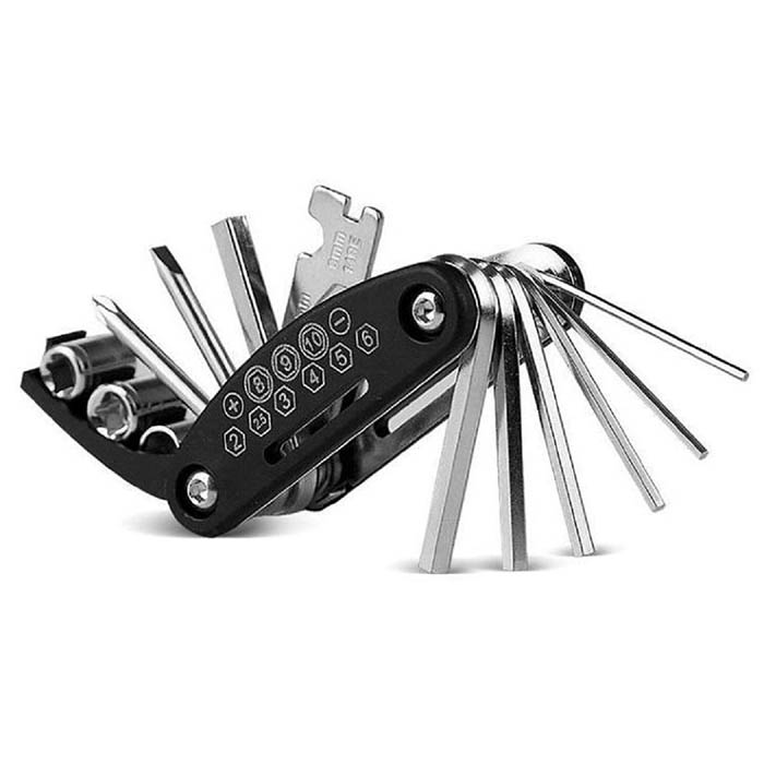 - 16 function all in one tool: Socket Hex Wrench 8/9/10/mm, Slotted Screwdriver, Phillips Screwdriver, Socket Extension Rod, Solid Wrench 8/10/15/mm, Hex Key Wrench 2/2.5/3/4/5/6mm,Spoke Wrench