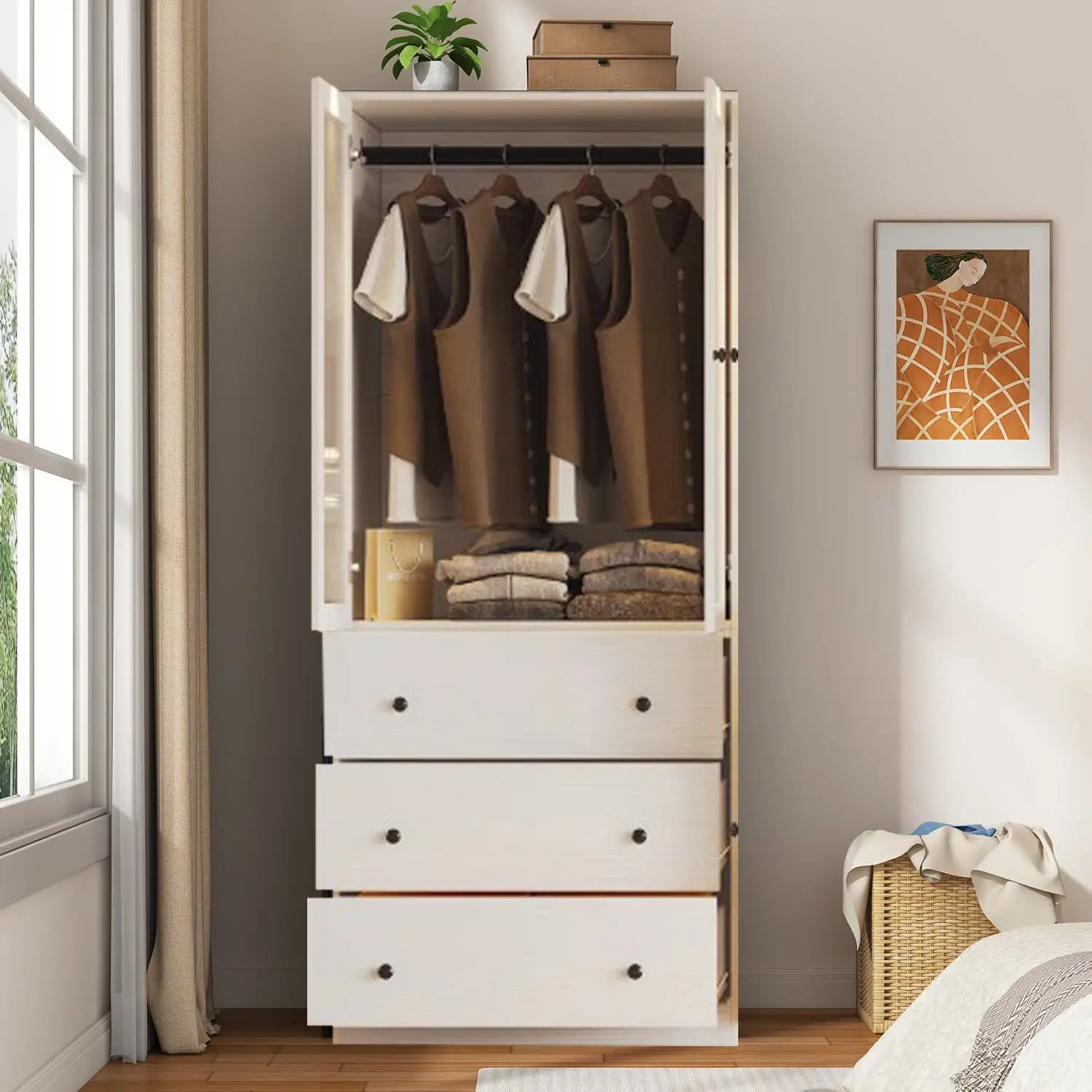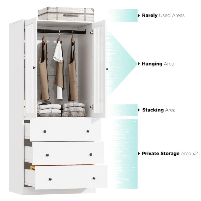 2 in 1 wardrobe White Modern Armoire , 2 Door Fluted Glass Hanging Road with 3 Drawer Storage Wardrobe Almari, 2 Part Glass Almirah Hanging Road with Srorage Drawer Almari
