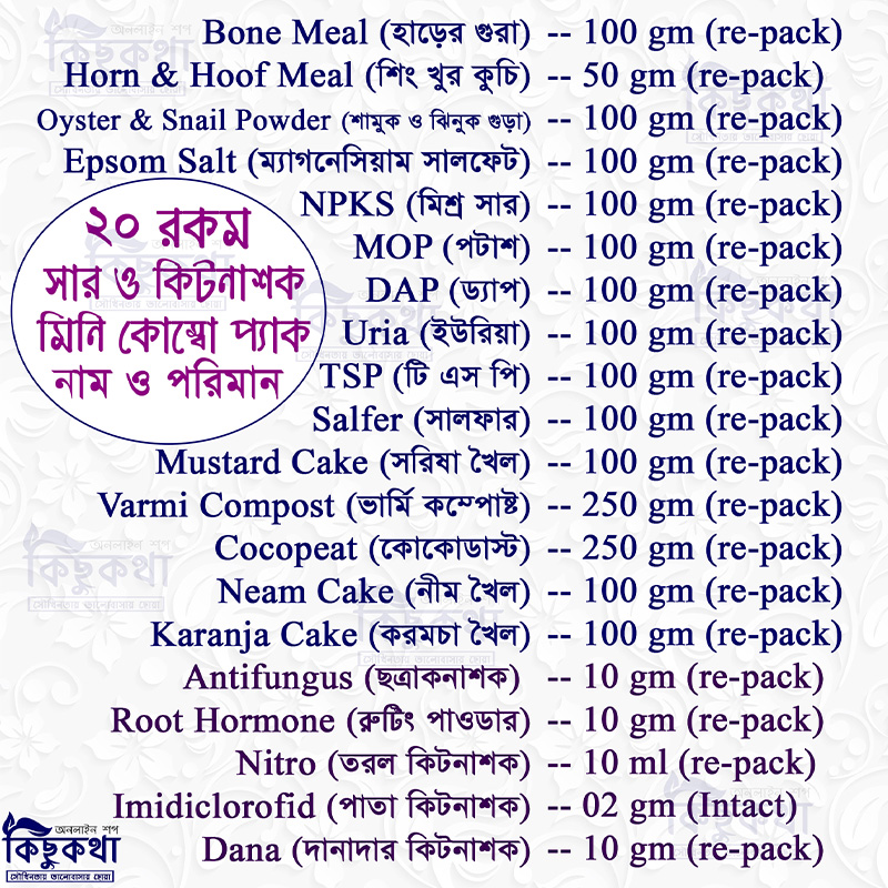 ব্যবহার: পাতা ও মাটিতে স্প্রে করে। সব ধরনের গাছে ব্যবহার করা হয়।