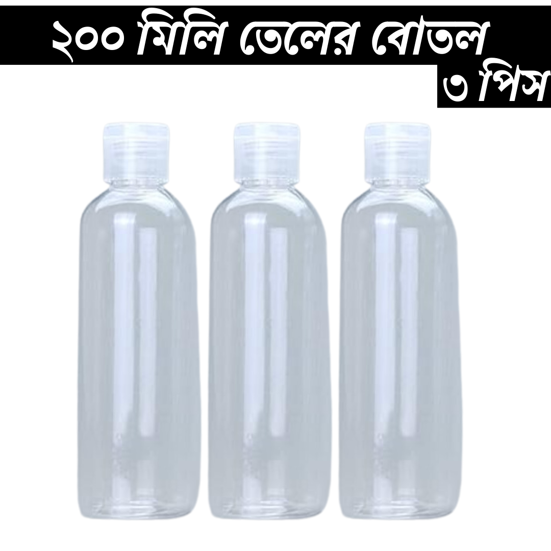 Plastic Oil Bottle Tiptop Cap 200Ml Transparent- 3 pcs is a set of clear, refillable PET plastic bottles designed for safely storing and dispensing various oils and liquid products. Each bottle has a 100 ml capacity and comes with a secure flip (tiptop) cap that helps prevent leakage and makes pouring or applying oil easy and controlled.