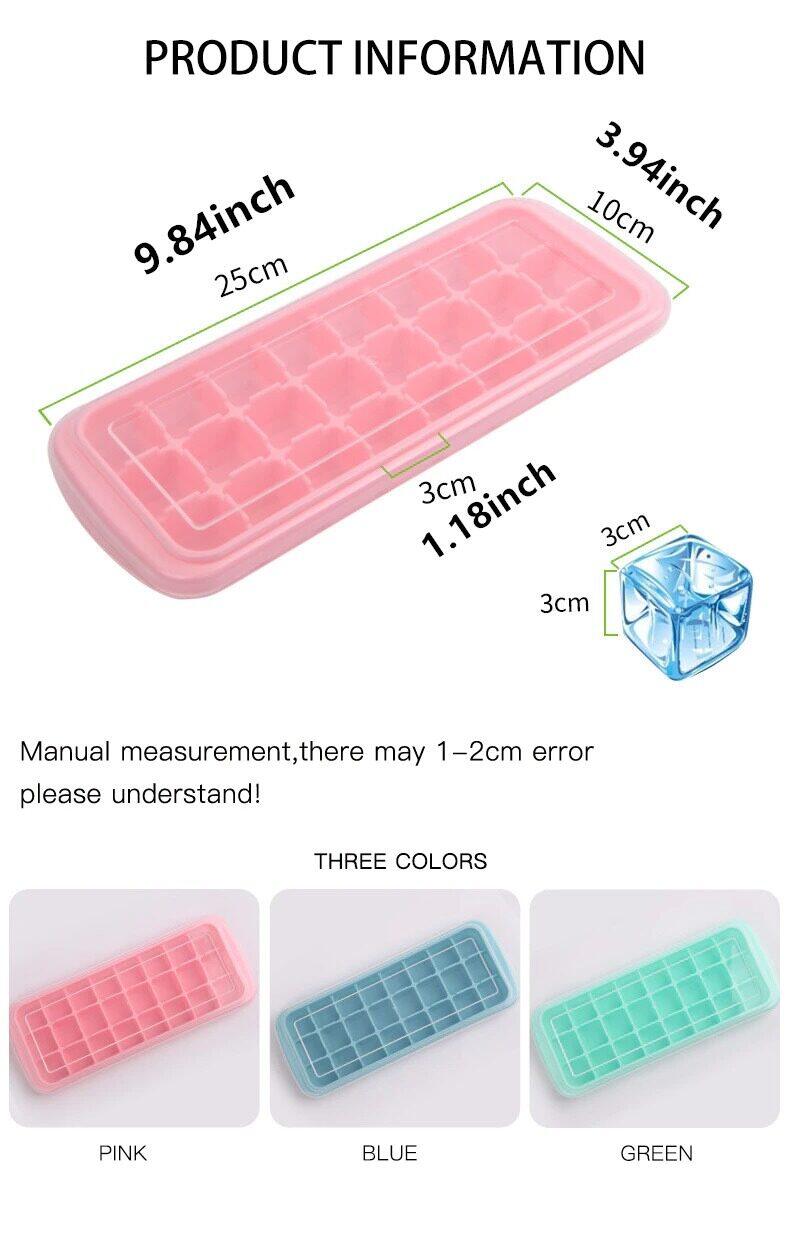 Product name: 24 Cavity Silicone Ice Cube Mold Reusable Silicone Ice Mold Ice Cube Tray for Summer Whiskey Cocktail With LidProduct size: 25*10*3cm 9.84*3.94*1.18inch Material: food grade siliconeHeat resistance temperature: minus -40 degrees to +240 degrees