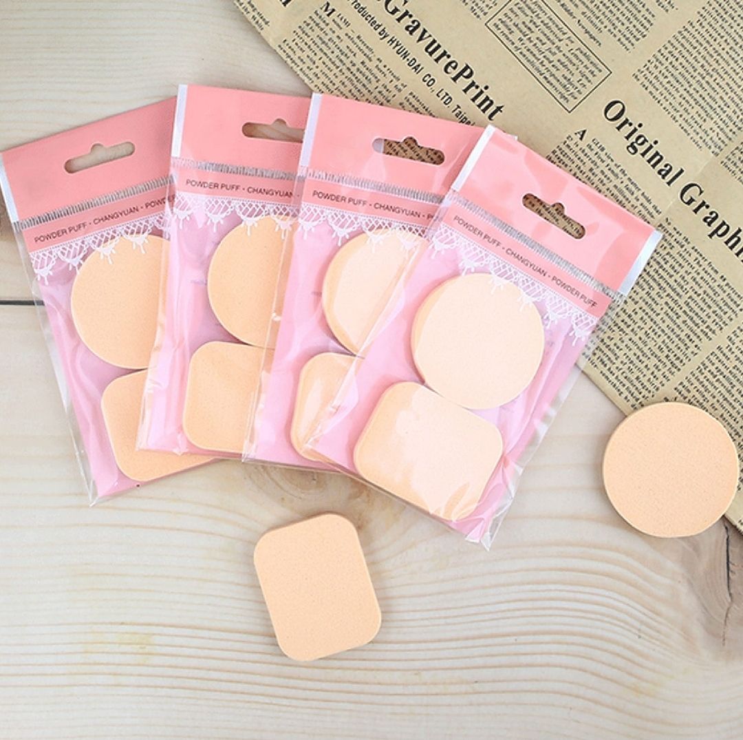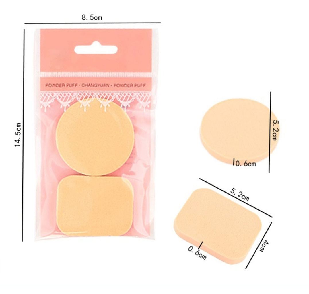 The length of the square shape poer puffs is 5.2cm, the width is 4cm, the thickness is 0.6cm, and the diameter of the round shape poer puffs is 5.2cm and the thickness is 0.6cm.