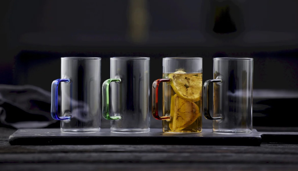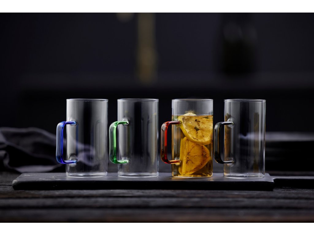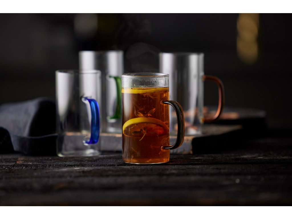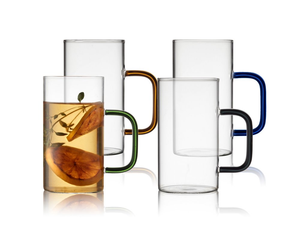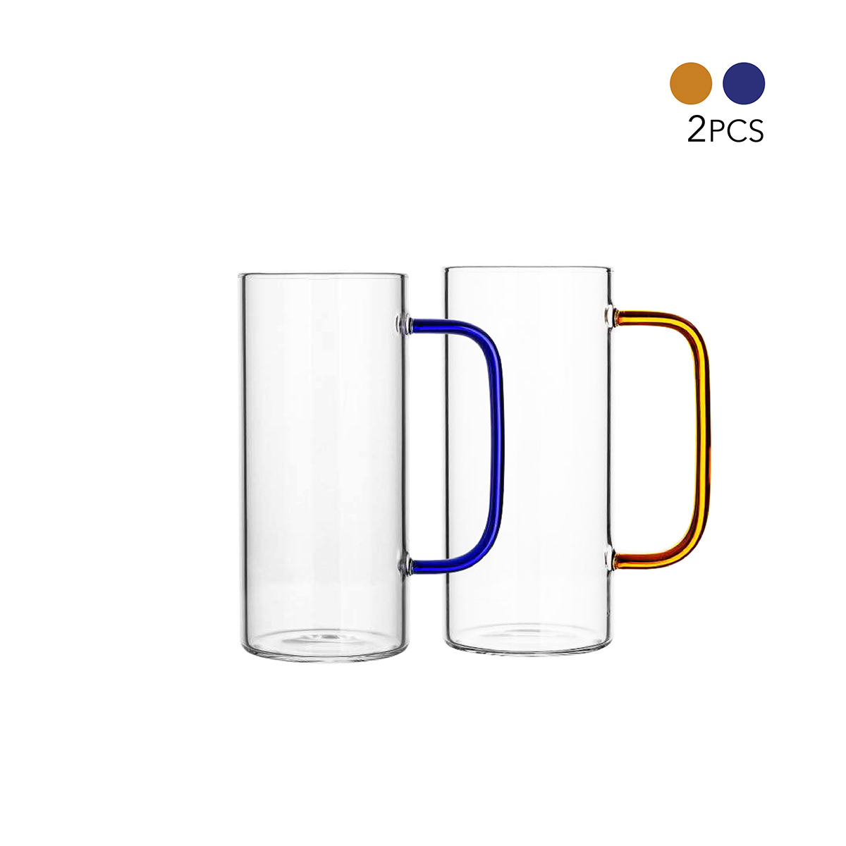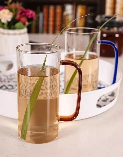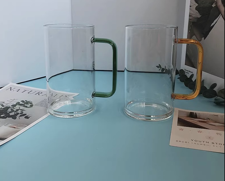 - high boron, lead-free glass, etc. High temperature resistant, safe in use; forged decor, Simple and stylish; wide yellow and blue handle, beautiful atmosphere; large capacity, more convenient drinking water, , milk, tea, drinks etc.
