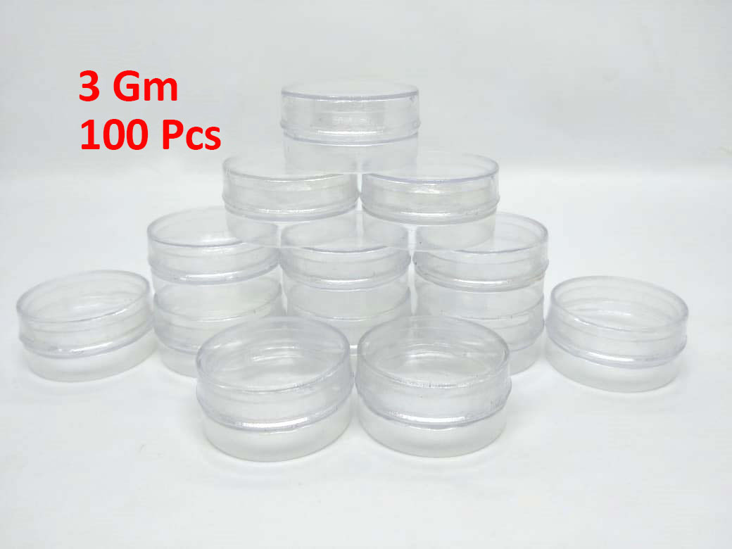 The 3 Gm Mini Empty Jar 100 Pcs pack offers compact, high-quality plastic containers ideal for cosmetic sampling and storage. Each jar holds 3 grams (about 3ml) and comes with secure screw lids for leak-proof use
