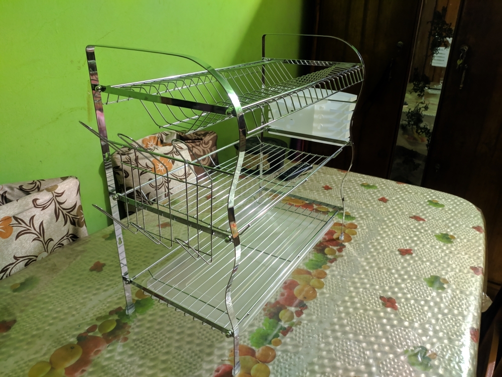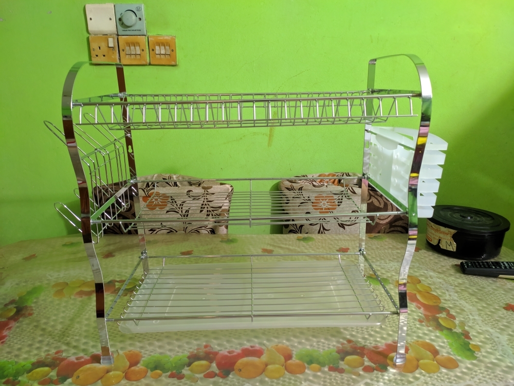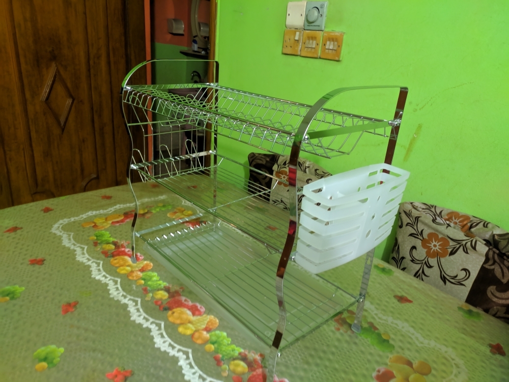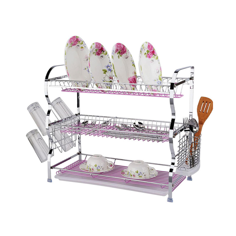 Modern design 3 tier kitchen dish drying rack and storage system made with heavy duty and rust-resistant material for stability and durability. The top tier rack is for holding plates, the middle layer mugs and cups while the flat bottom rack can be used for bowls. This storage rack can save room for making your kitchen more neat.