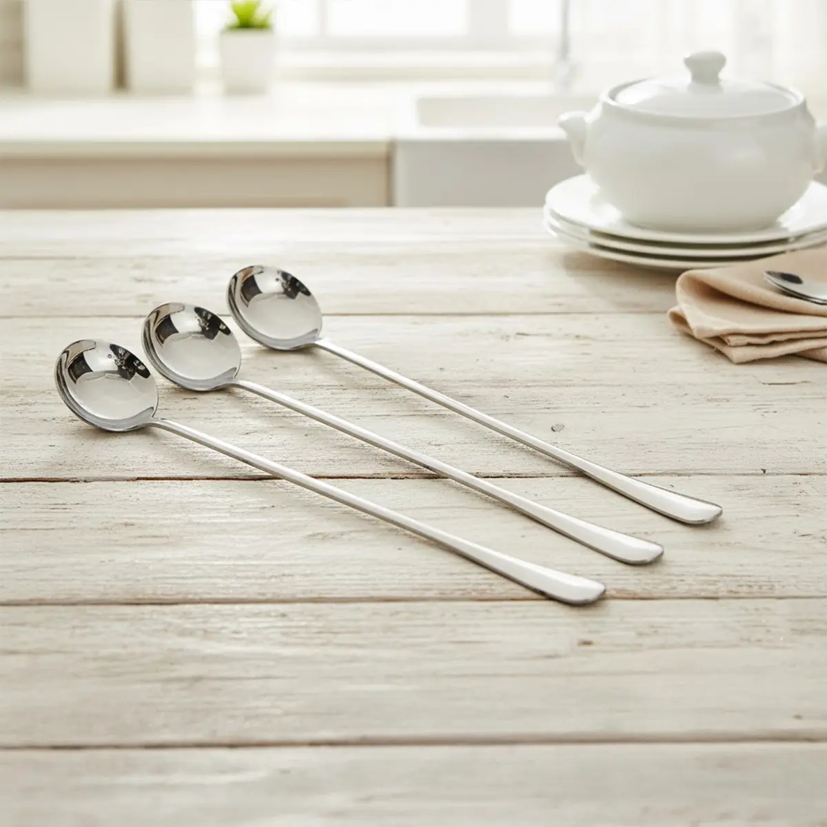 Step 1: The product attributes are valid. Step 2: No additional keywords provided. Step 3: Introducing the 3 Pieces Long Spoons, crafted from durable stainless steel, perfect for enhancing your dining experience. These sleek and long-handled spoons are designed for comfortable use and are ideal for stirring, serving, and enjoying your favorite dishes. Elevate your dining table with this essential cutlery set, suitable for everyday meals and special occasions. Step 4: The tone of voice is in accordance with Informative. The product description has been successfully generated.