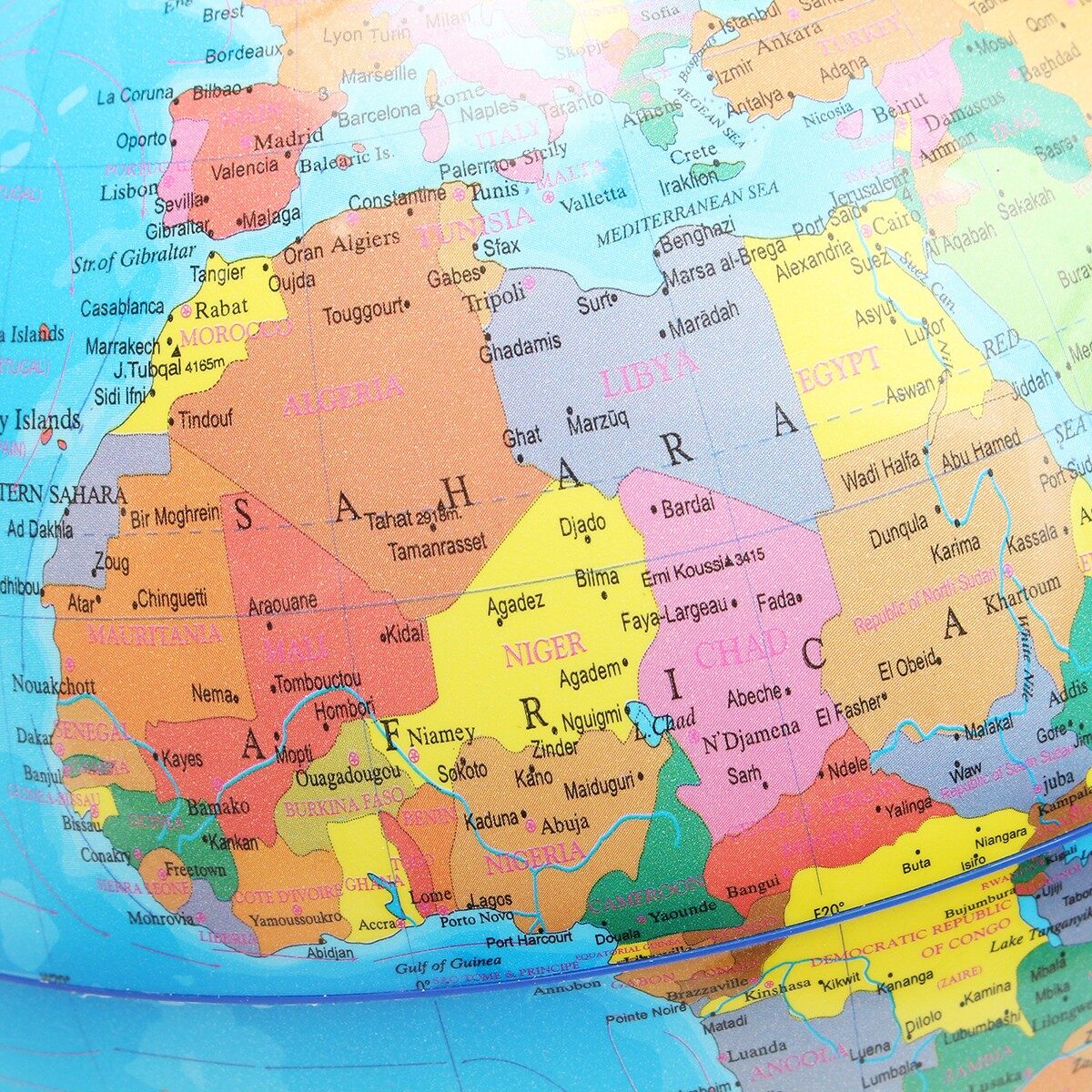 A simple, yet informative and educational desktop world globe beautifully arranged in a spectrum of vivid colors.Expand your perspective and enhance your knowledge of our earth and its geography.It features up-to-date cartography, vibrant blue oceans and colorful landmasses with political boundaries.The globe is held by a semi meridian mounted on a durable black colored plastic base.Perfect for home, school, and office. Great for children & adults of all ages.Features vibrant blue oceans and color landmasses with political boundaries.Durable gold plastic base and high clearly Printing provide you a wonderful using experience.