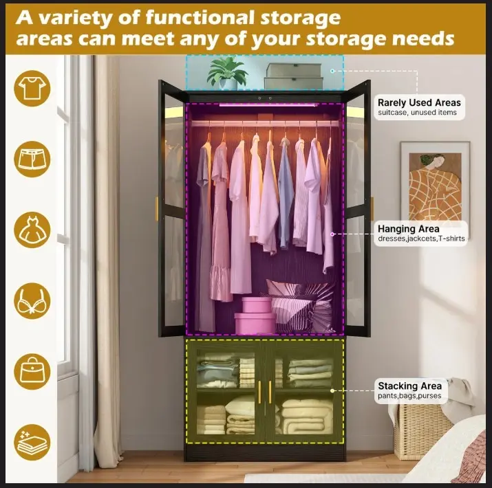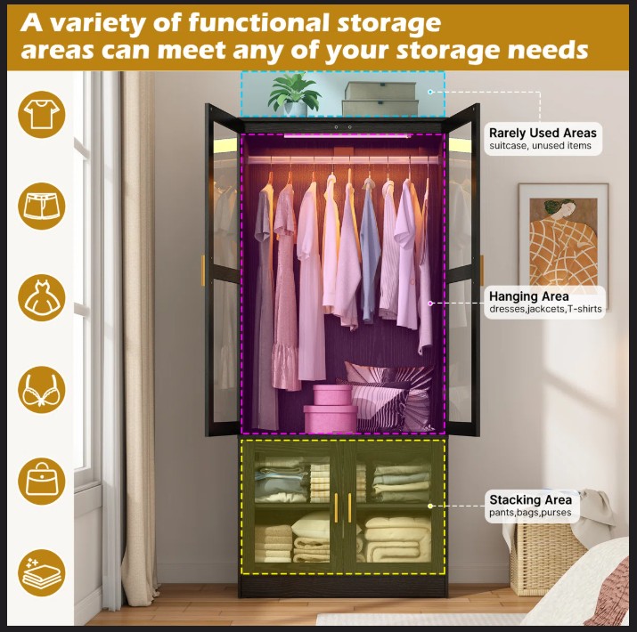 4-Door 71" H Armoire With LED Sensor Light And Hanging Rod & 2 Door Shalve Storage Wardrobe, Modern Black LED Sensor Light Almirah