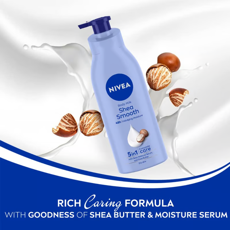 Indulge in deep moisture care with the new Nivea shea smooth body lotion. Enriched with shea butter and deep moisture serum, it deeply moisturizes dry skin and gives it a silky smooth feeling that lasts for up to 48 hours.