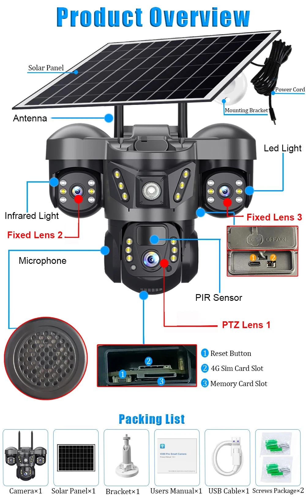 - Energy Storage Solar Charging Panel: It can use the sun's rays to store energy and convert it into the power supply needed by the camera at any time when you have a power outage.