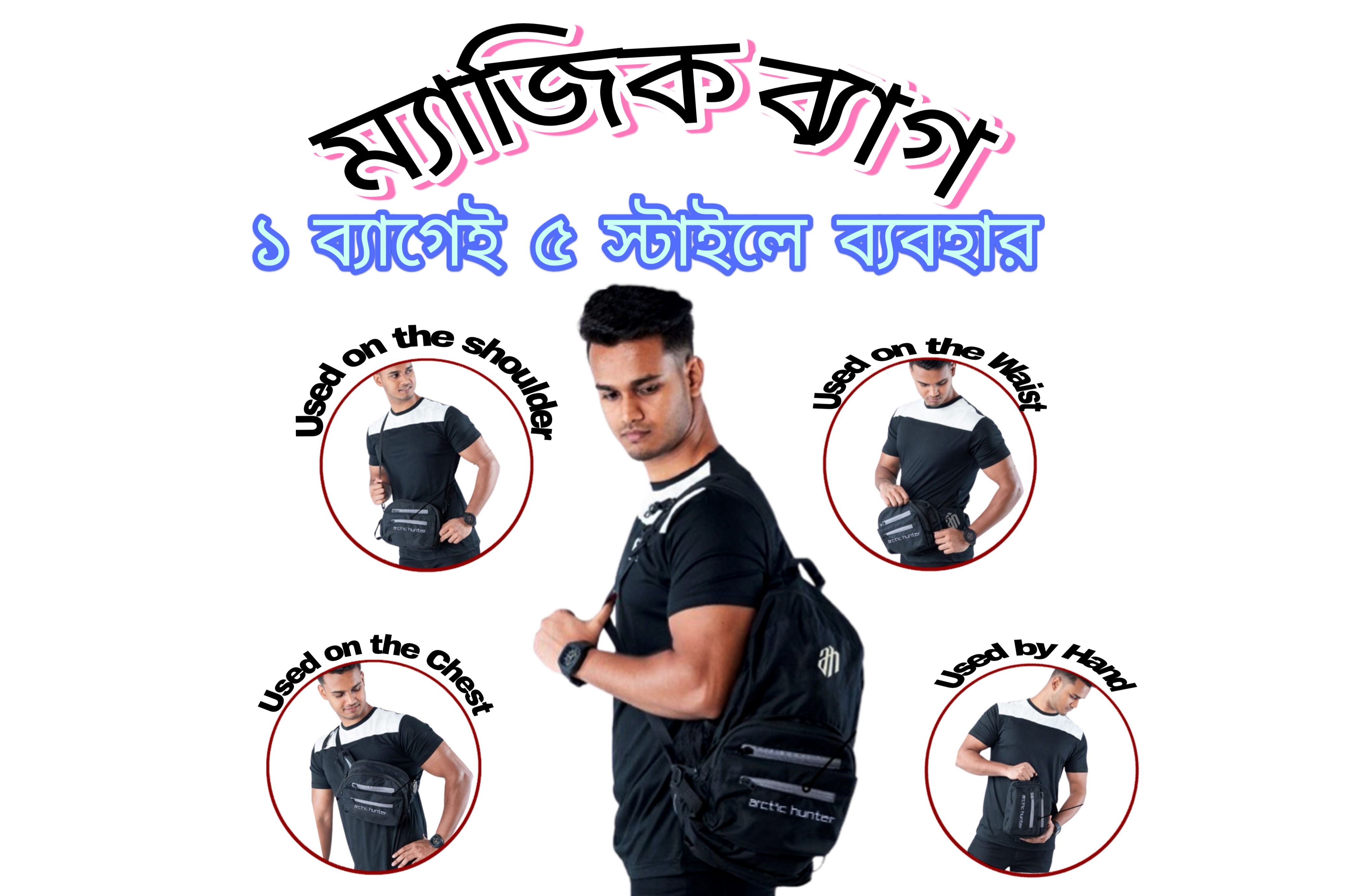 5 In 1 Magic Bag , 1 bag All solution( messenger bag , crossbody bag , shoulder bag ,chest bag , waist bag , hand bag , Regular used backpack ) All in 1 combo Magic bag can be used in 5 ways. You can use this bag anywhere in school, college, travel, tour. This bag has many small pockets where you can keep keys, headphones, mobile, charger, power bank etc. separately. This bag can be made from small to large, so you can easily keep all the necessary items. You can carry it in one hand, you can carry it on one shoulder, you can carry it on your waist, you can carry it like a cross bag on your chest, and you can use it like a school bag on both shoulders. Material: This backpack is made of water and Tear Resistant Nylon fabric Outer Dimensions as a small bag : 8inch x 6. inch x 4.53 Inches. Outer Dimensions as a Backpack bag : 16 inch x 8. inch x 5.53 Inches. wide, prefect for short Trips or hiking and daily use Outside Material :Polyester Color : Black