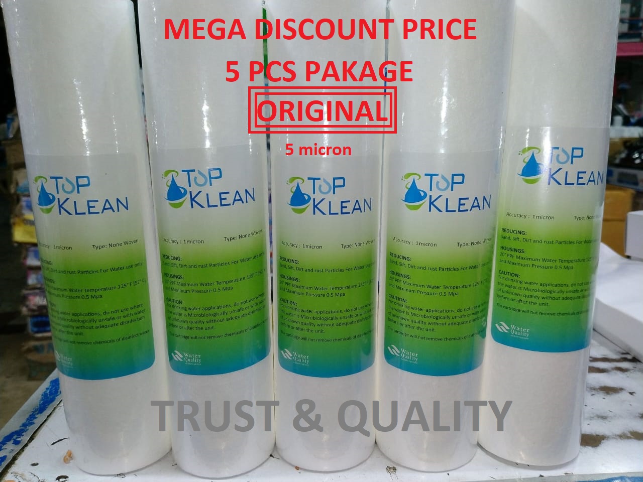 Product details of 5Micron PP SEDIMENT FILTER - 5PCS TOP KLEAN Product Type: PP Sediment Filter Cartridge Assure Safe Water High Quality Product Remove More Small Particles Remove More Dirt Remove Other Minute Impurities
