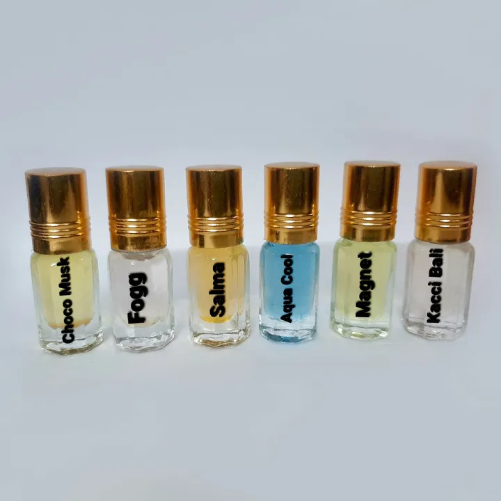 - This mini combo attar perfume set for men is the perfect way to experience a variety of scents over the course of 6 months. With 6 different fragrances to choose from, including Choclate, Eogg, Salma, Cool, Magnet, and Kachi Bali, you'll have a scent for every occasion. Each bottle contains 3ml of non-alcoholic perfume, making it a great option for those with sensitive skin. This set is perfect for anyone who loves to experiment with different scents and wants to find their signature fragrance.