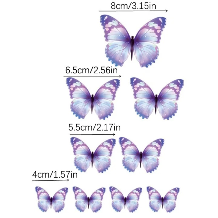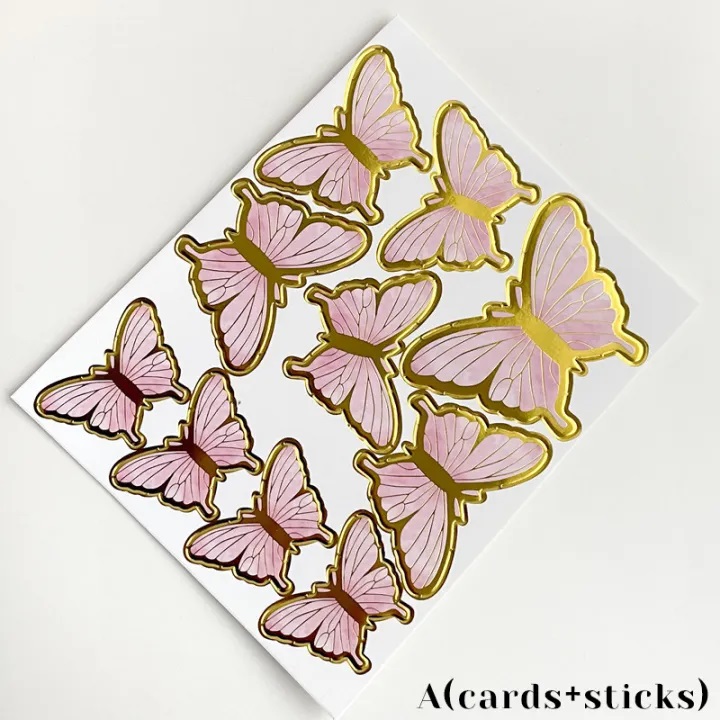 2. The package contains 9/10 pieces of butterfly cake decorations with the same number of glue and sticks. Several colors for you to choose.