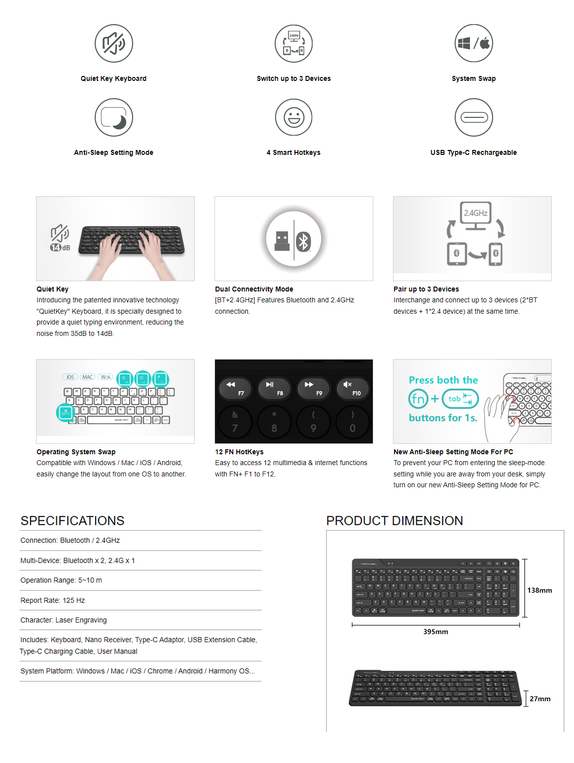 Includes: Keyboard, Nano Receiver, Type-C Adaptor, USB Extension Cable, Type-C Charging Cable, User Manual
