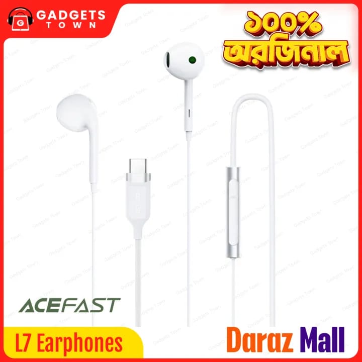 The ACEFAST L7 are USB-C wired earphones designed for modern Android phones and tablets. The semi in-ear fit keeps things light and comfortable, while the built-in anti-spray noise-reduction mic improves voice clarity on calls. A 1.2m flexible cable made from TPE + ABS + aluminum alloy + nylon resists pulls and tangles for everyday durability. At just about 16 g, they’re easy to carry and plug-and-play—no pop-up issues—making the L7 a simple, budget-friendly pick for commuting, classes, and online meetings in Bangladesh.