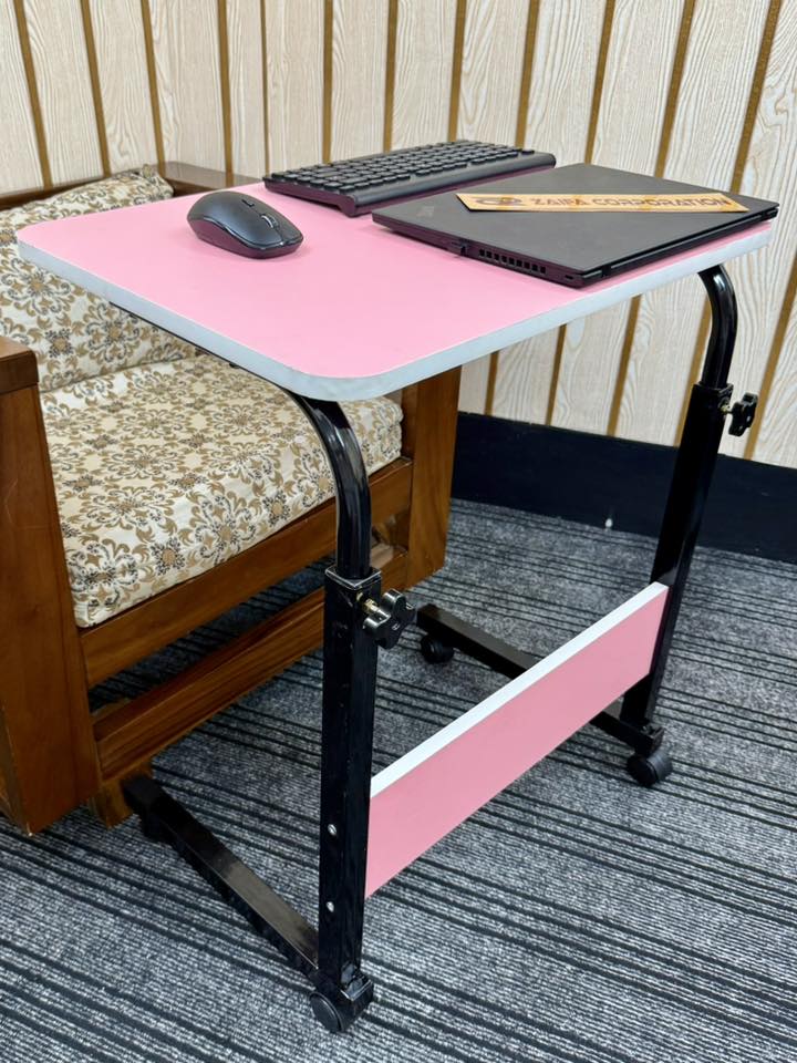 Bring comfort and flexibility to your daily routine with this modern adjustable laptop table. Designed for studying, working, or relaxing, this sleek desk features a smooth pink wooden top, sturdy metal frame, and rolling wheels for easy movement. Perfect for both home and office use!