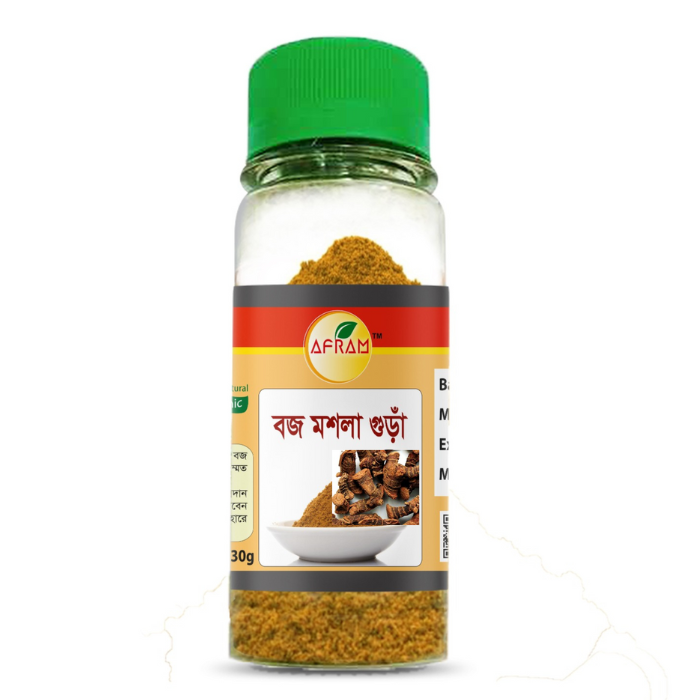 পণ্যের ধরন: প্রিমিয়াম কোয়ালিটির বচ মশলা পাউডার বিশুদ্ধ এবং তাজা মুদি আইটেম. ব্র্যান্ড নাম: আফরাম পণ্য: বচ পাউডার ওজন: 30 গ্রাম