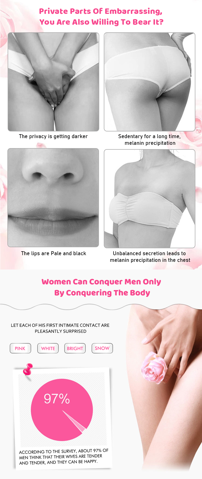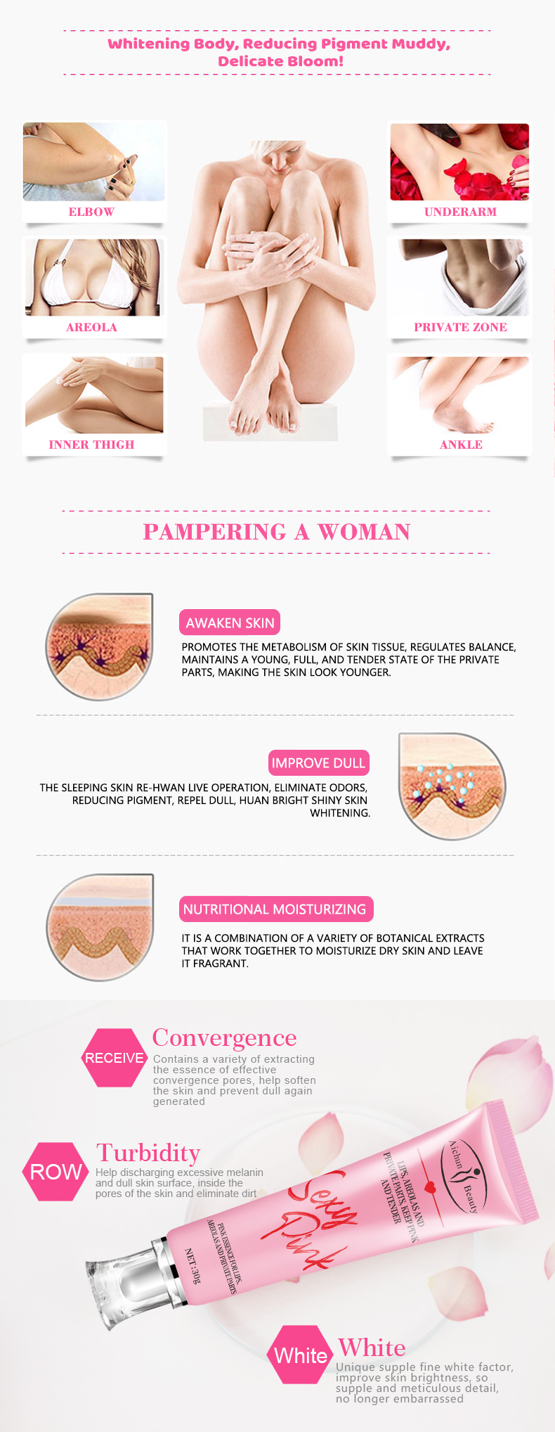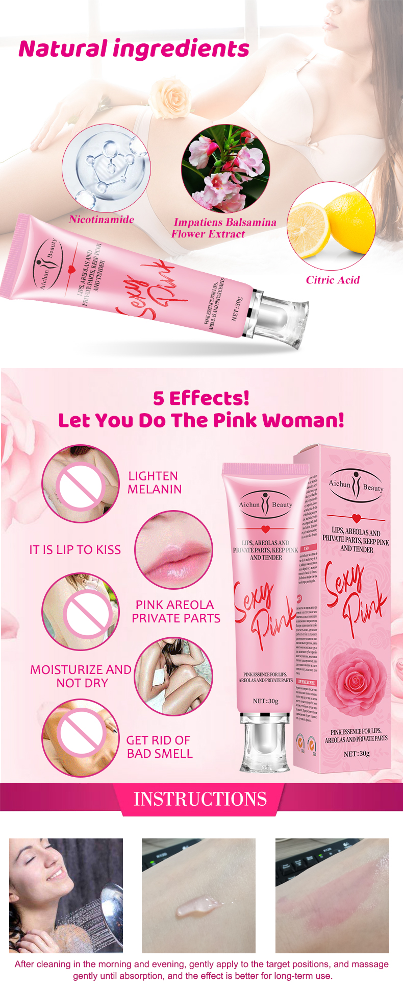 Features: It contains natural plant extract ingredients and tender pink active nutrient factors, which quickly reach the deep skin, improve the rough and dull lips, break down the areola melanin and make areolas pink, moisturize the labium and break down labia melanin, leaving your privates parts pink and attractive like a girl.