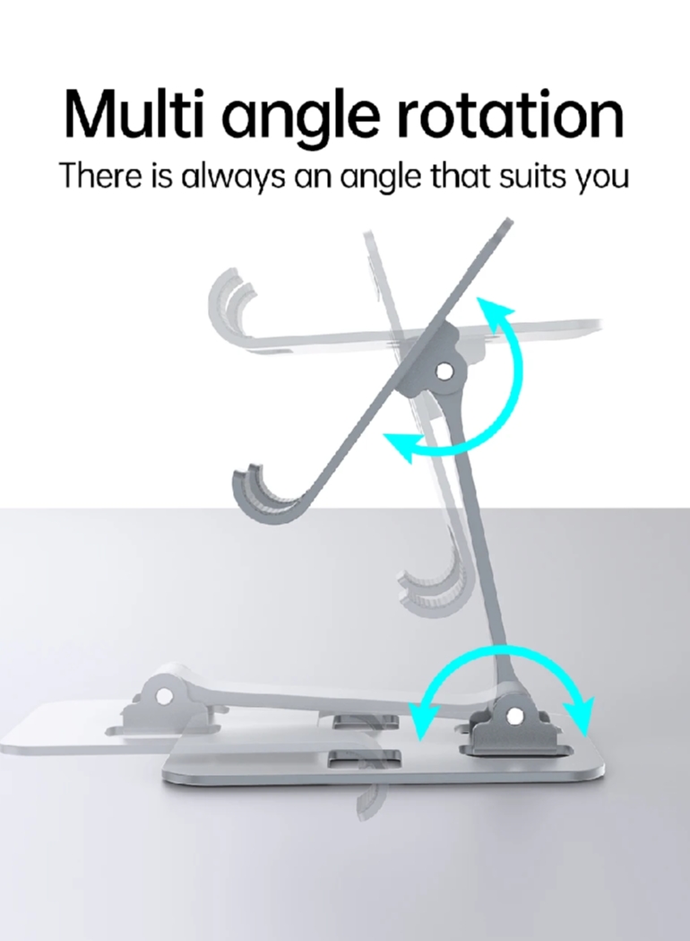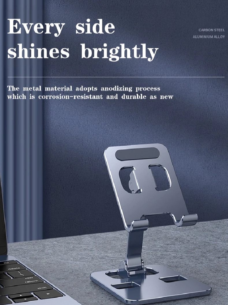 A foldable Carbon Steel + aluminium desktop phone stand with an anti-slip silicone pad to prevent your iPhone or iPad from moving or falling. The multi-angle adjustable phone stand for the office is essential for organizing the workspace on tablets