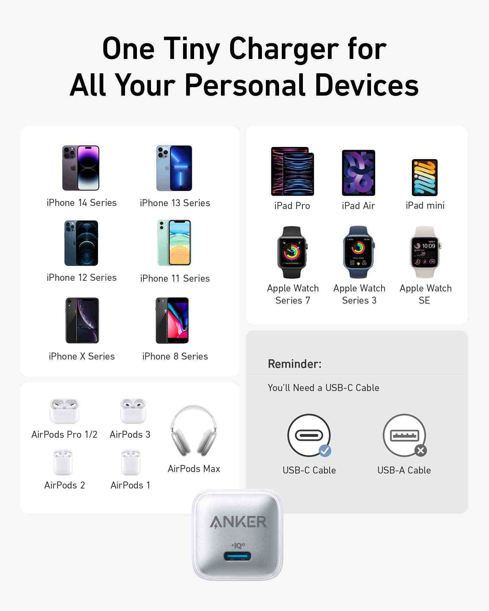 Compatibility iPhone 14 / 14 Pro / 14 Pro Max / 13 / 13 Mini / 13 Pro / 13 Pro Max / 12 / 12 mini / 12 Pro / 12 Pro Max / iPhone SE (2nd generation) / 11 / 11 Pro / 11 Pro Max / XS / XS Max / XR / X / 8 Plus / 8; iPad 10.2-inch/; iPad mini 8.3-inch/; iPad Pro 12.9-inch 4th / 3rd / 2nd / 1st generation; iPad Pro 11-inch 2nd / 1st generation; iPad Pro 10.5-inch; iPad Air 4th / 3rd generation; iPad 8th / 7th generation; iPad mini 5th generation, AirPods, Apple Watch