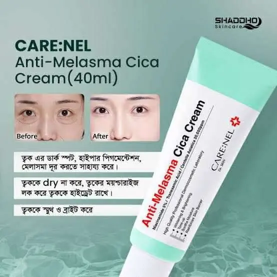 👉তাহলে 5% Niacinamide এবং 2% Centella asiatica extract যুক্ত "𝐂𝐀𝐑𝐄:𝐍𝐄𝐋 𝐀𝐧𝐭𝐢-𝐌𝐞𝐥𝐚𝐬𝐦𝐚 𝐂𝐢𝐜𝐚 𝐂𝐫𝐞𝐚𝐦 𝟒𝟎𝐦𝐥" ব্যবহার করে দেখুন।