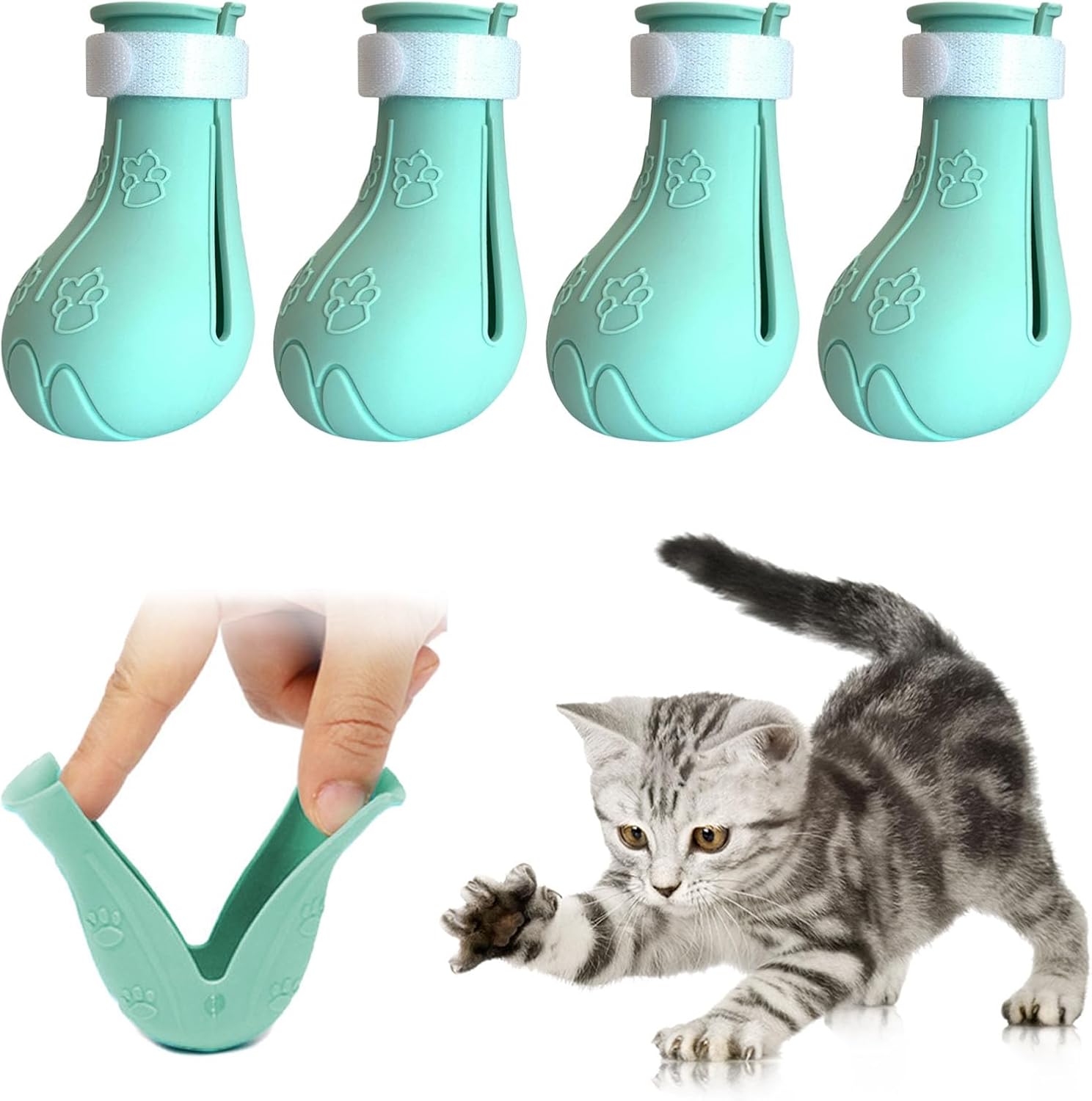 High-Quality Material: silicone cat boots, anti cat scratch, are made of soft food-grade silicone, soft and thick texture very durable, comfortable to wear, and will not harm kittens, easy for cats to accept. 3 colors available: blue, green, pink.
