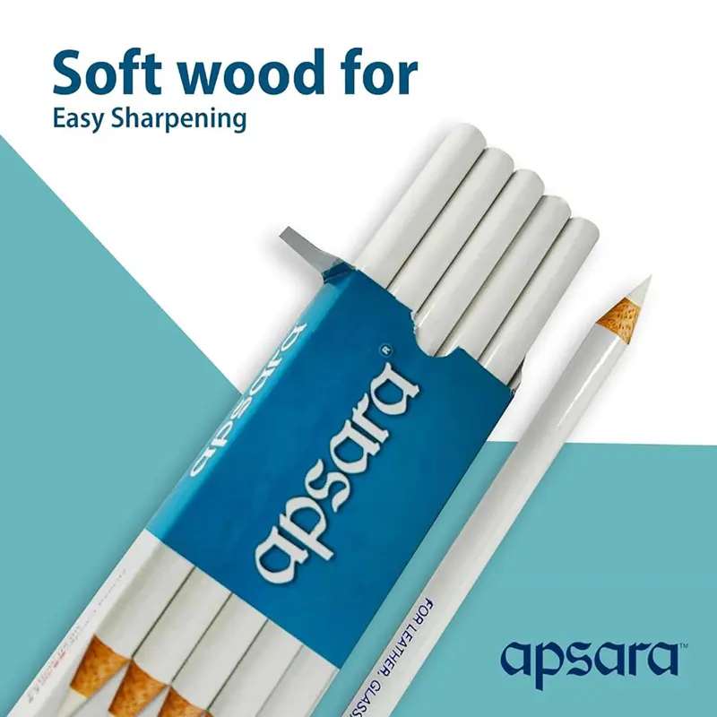 A single wood‑cased pencil whose core is specially formulated (wax‑based) to mark on smooth surfaces like glass, metal, vinyl and more. The mark is designed to be bold/visible even on non‑paper surfaces. The pencil may come in a specific colour version (for example white for marking on dark glass, black/blue for lighter surfaces). It is sharpenable like a standard pencil, and the lead is formulated so it doesn’t scratch the surface but still leaves a visible trace.
