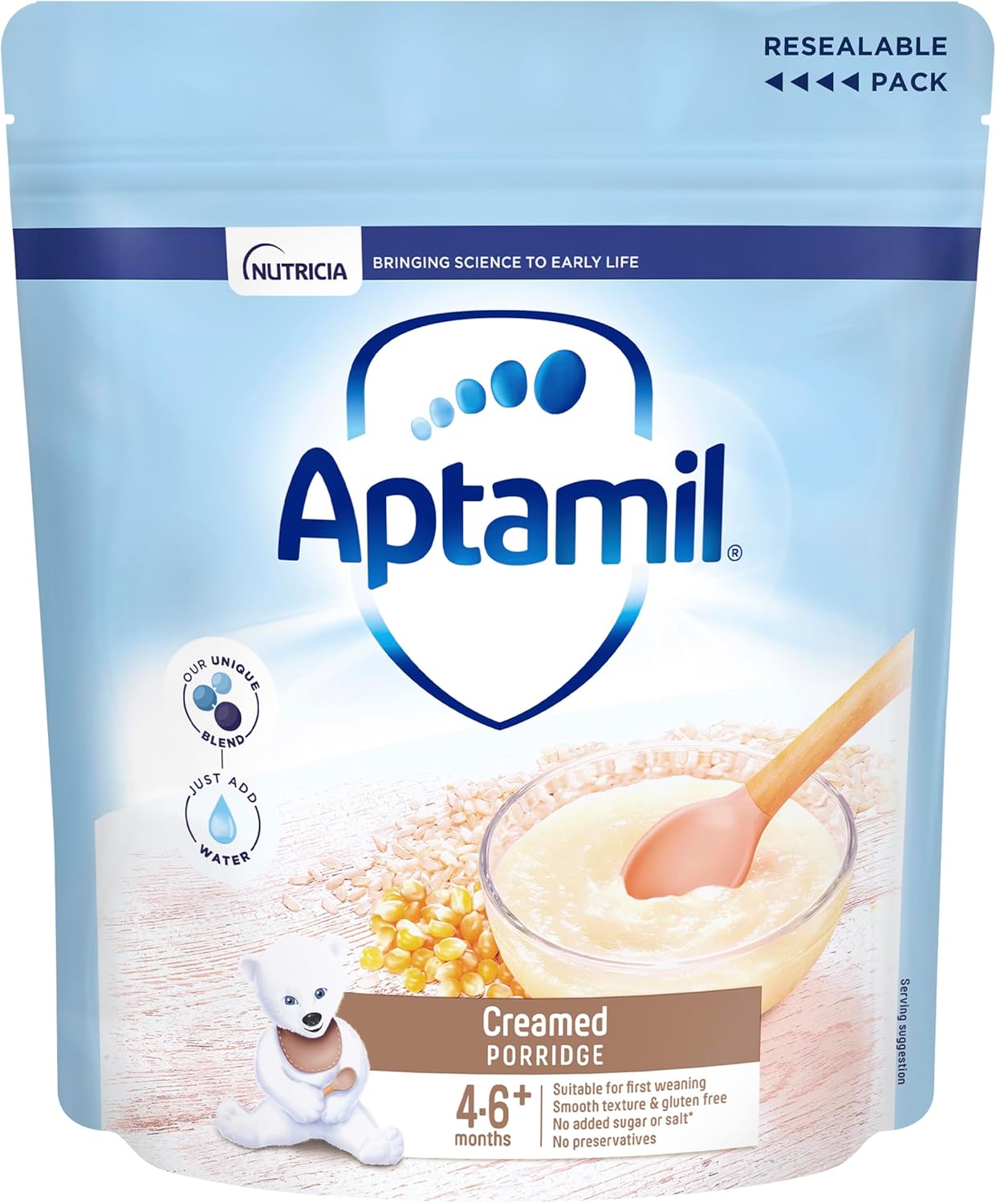Milled corn and rice porridge with milk. The smooth texture of our creamed porridge makes it suitable as a first weaning food. Our deliciously creamy porridge comes in a resealable pack for safe and easy storage, contains added vitamin A, C and D, is gluten-free and contains no preservatives, no added sugar or salt*.