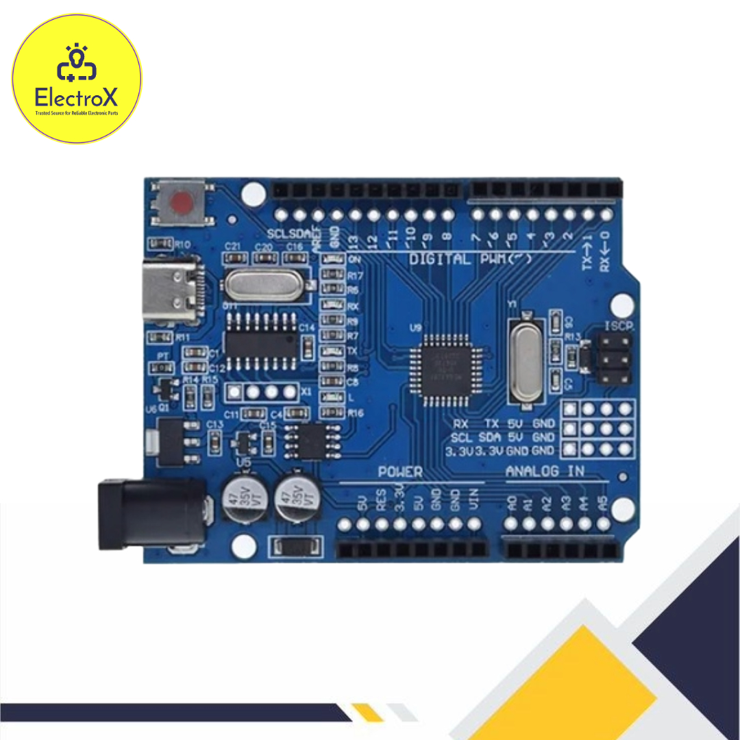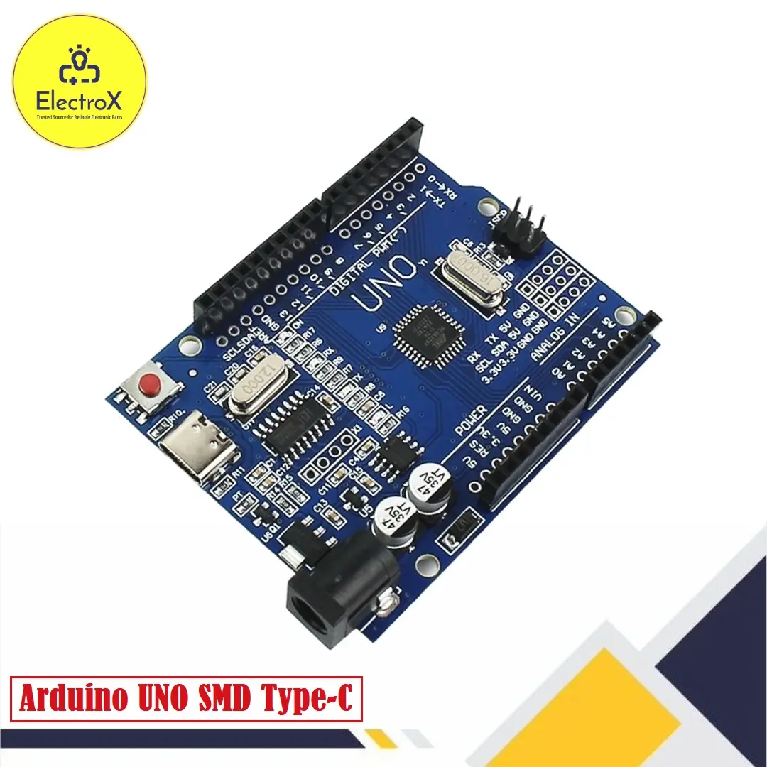 The Arduino UNO R3 ATMEGA328P SMD CH340 Type-C is a compact and versatile microcontroller board designed for electronics projects and prototyping. Featuring the ATmega328P microcontroller in an SMD package, it delivers reliable performance with 14 digital I/O pins, 6 analog inputs, and a clock speed of 16 MHz. Unlike standard models, it includes a CH340 USB-to-serial converter for cost-effective, stable communication, and a Type-C USB port for modern connectivity. Fully compatible with the Arduino IDE, this board is ideal for beginners and advanced users alike, enabling seamless project development in robotics, IoT, and automation with wide community support.