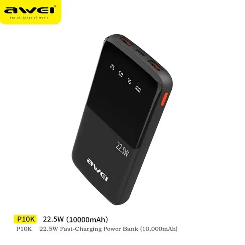 - The Awei P10K 10000mAh 22.5W Fast Charging Digital Display Power Bank is a powerful and versatile solution for those who need reliable charging on the go. With a large 10000mAh capacity, it ensures your devices stay powered throughout the day, whether you’re at work, traveling, or running errands. Moreover, its high-speed charging capability, offering up to 22.5W output, allows you to quickly charge multiple gadgets at once, saving both time and hassle.