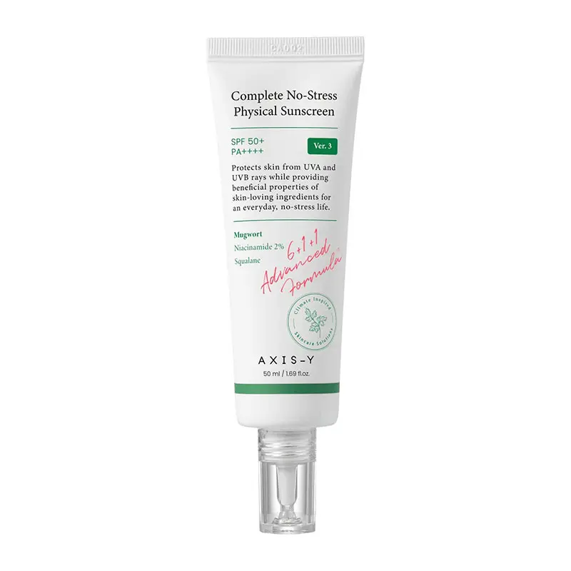 Axis-Y Complete No-Stress Physical Sunscreen SPF 50+ PA++++ is a gentle yet powerful daily sun protector designed for all skin types, especially sensitive skin. Enriched with Mugwort, Niacinamide (2%), and Squalane, it not only shields against harmful UVA/UVB rays but also soothes, hydrates, and strengthens the skin barrier. Its lightweight, non-greasy texture blends seamlessly, leaving no white cast—perfect for everyday use.