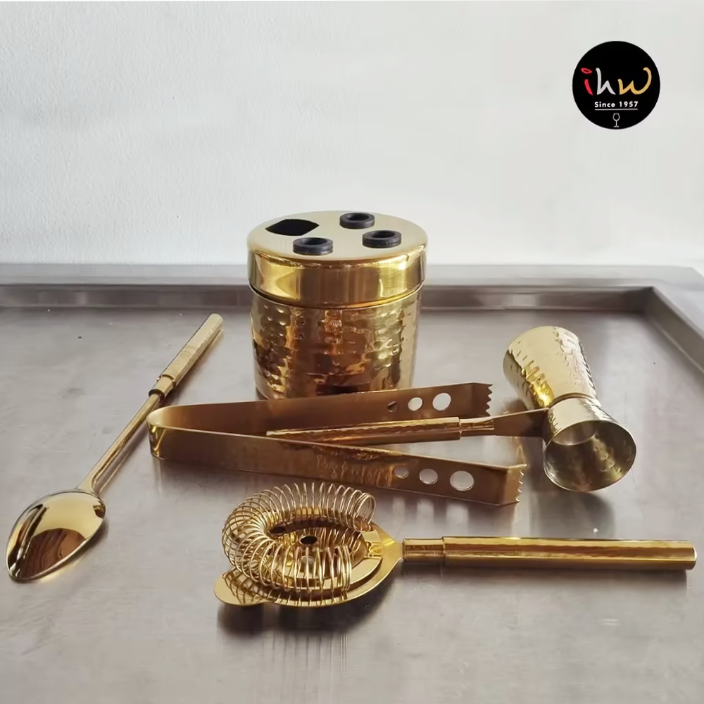 Elevate your home bar with the timeless elegance of the Venus Stainless Steel Bar Tool Set, crafted from high-quality stainless steel with a polished gold finish. Designed for both functionality and display, this hand-hammered set offers everything you need to craft professional-level cocktails at home.