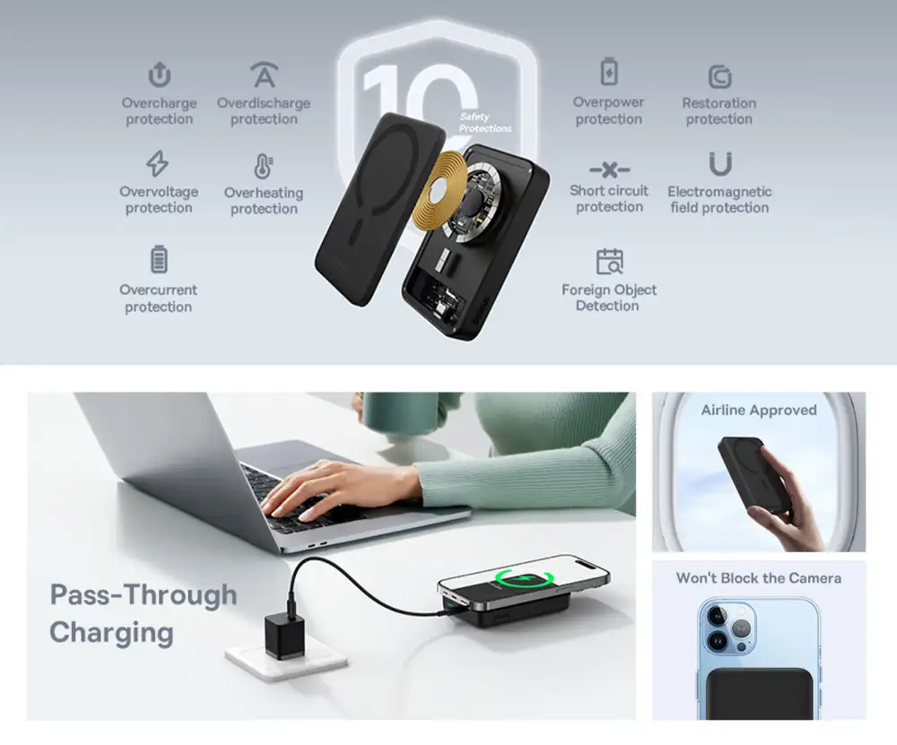 Designed specifically to complement modern smartphones (including MagSafe-compatible iPhones), it snaps securely to the back of your device for effortless, cable-free charging. Its ultra-compact, pocket-friendly footprint means it won’t block your camera lens, allowing you to keep using your phone comfortably while it charges on the go.