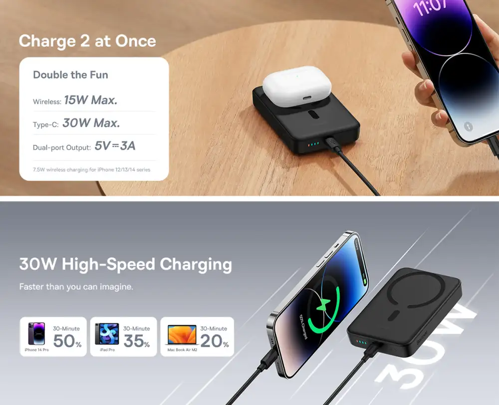 - 30W PD Fast Charging: Use the Type-C port to deliver a massive 30W of power, capable of fast-charging your phone to 50% in just 30 minutes.