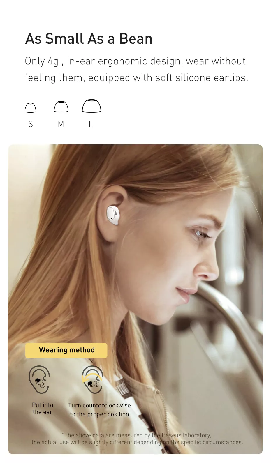 - Ultra small and lightweight. Only 4g, ergonomic in-ear design: Wear without feeling, equipped with soft silicone eartips (S / M / L).