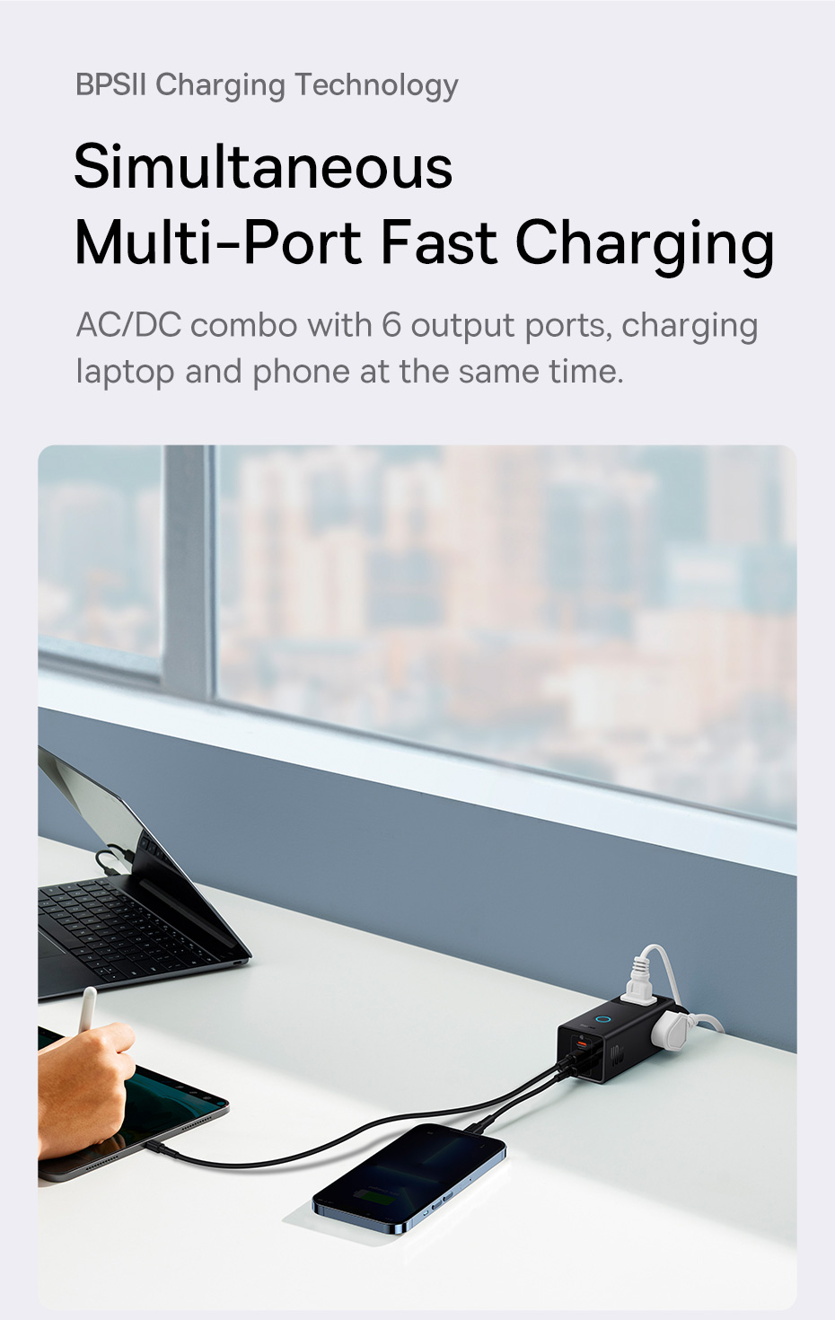 3*AC+Type-C*2+USB*1. Equipped with multiple output ports, the perfect solution to messy desktop and lack of port, good for your home or office