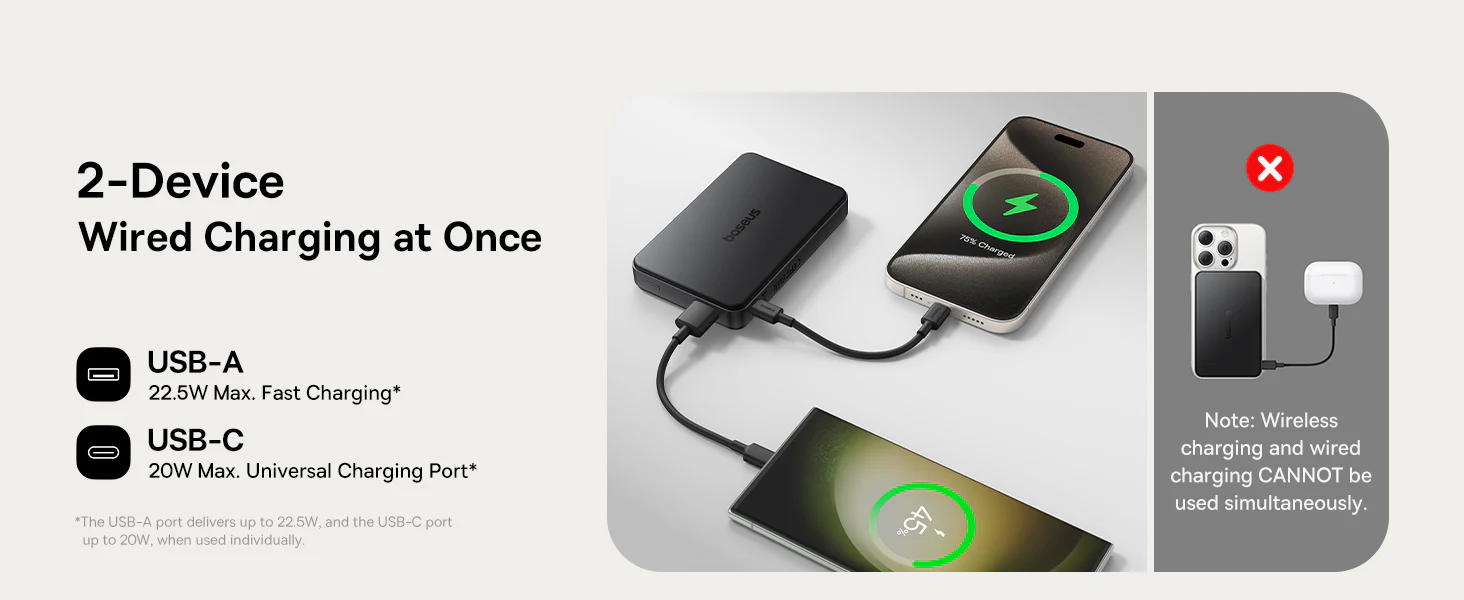 - ⚡【22.5W Max. 【Wired Charging】In addition to 15W wireless charging, the Apple Battery Pack is also versatile and compatible, offering a maximum output power of 22.5W for USB-A and 20W for USB-C. This allows you to charge two devices at the same time. Please note that wireless and wired charging CAN NOT be used simultaneously.
