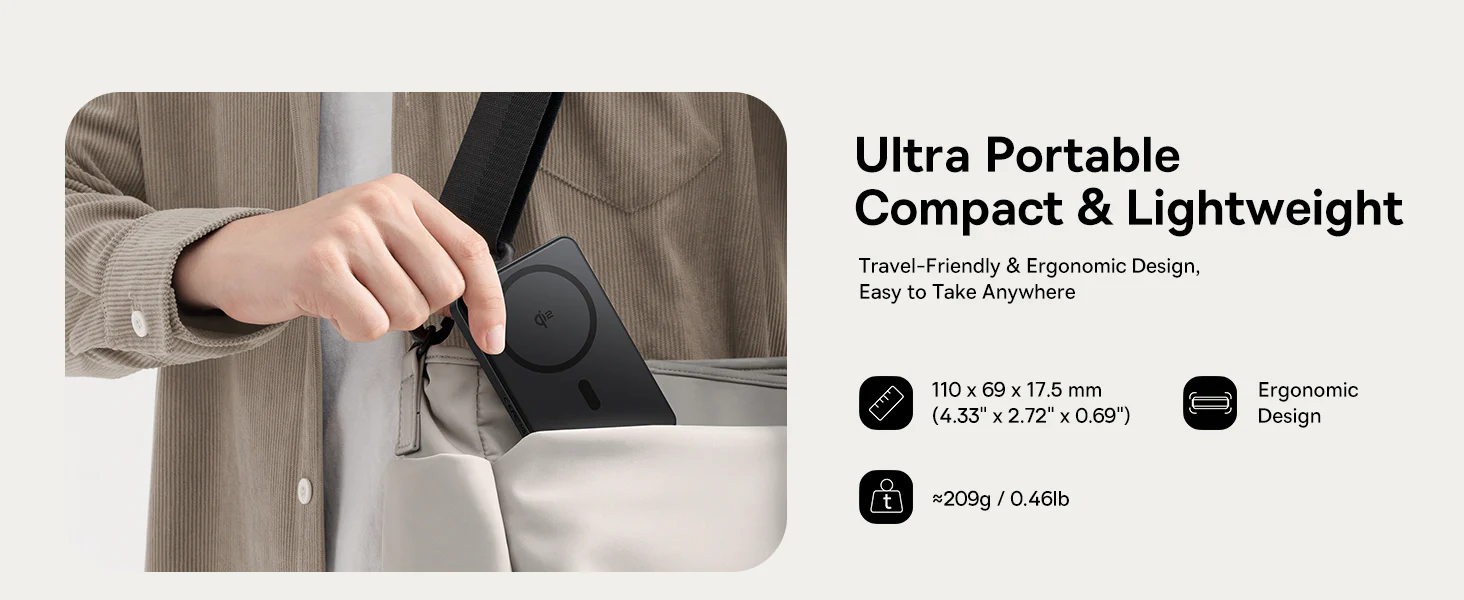 - Magnetic Latches & Ready: This Magsafe Power Bank Qi2 has ultra-strong magnets for immediate and secure attachment without pressing any buttons. Measuring only 4.2 x 2.3 x 0.75 inches, it is compact and portable for stable and easy charging of Magsafe compatible iPhones.